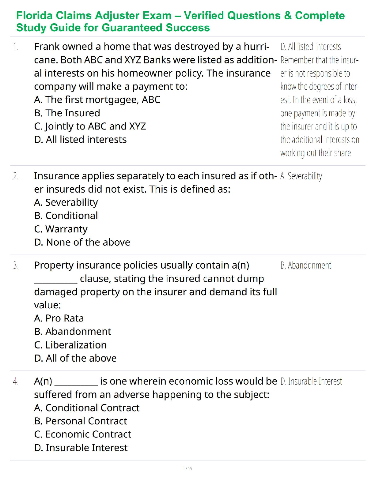 Prepare to ace the Florida Claims Adjuster licensing exam on your first try with our comprehensive 2025/2026 test bank. This essential study guide features a complete collection of verified questions and detailed, accurate answers covering all critical topics. Master concepts like property insurance policies, severability, abandonment clauses, and insurable interest. Our resource is expertly crafted to build your confidence, eliminate the need for costly resits, and launch your career in insurance adjusting. Get the ultimate prep tool for guaranteed success!