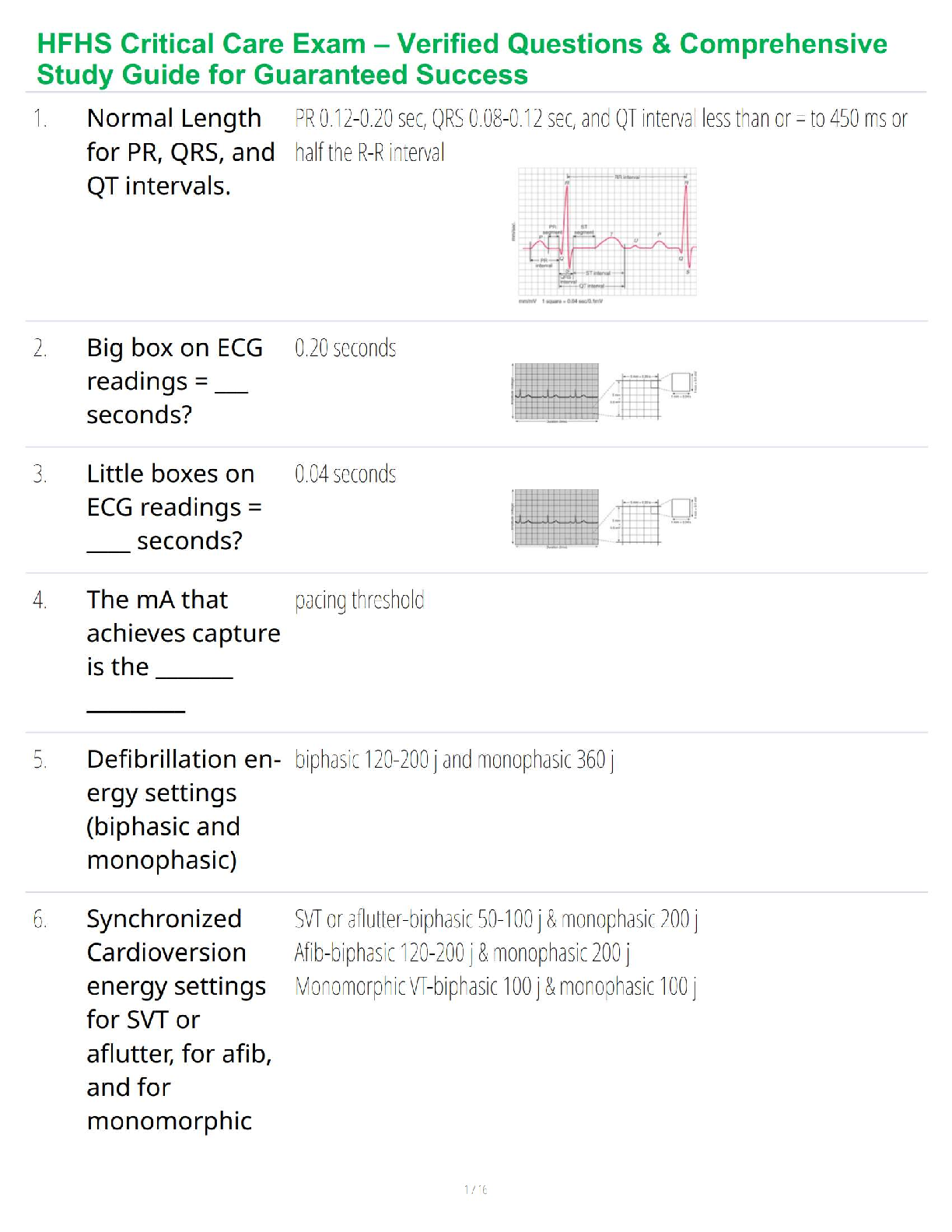 Prepare to excel in your HFHS Critical Care Exam with our newly updated 2025/2026 study guide. This comprehensive resource is packed with verified questions and detailed, accurate answers, covering essential topics you need to master. Dive deep into critical concepts such as ECG interpretation, including normal PR, QRS, and QT intervals, defibrillation energy settings, and synchronized cardioversion protocols. Our expertly compiled Q&A format is designed to simulate the real exam, boosting your confidence and ensuring you have the knowledge to pass on your very first try. Stop worrying about resits and secure your success with this essential study companion.