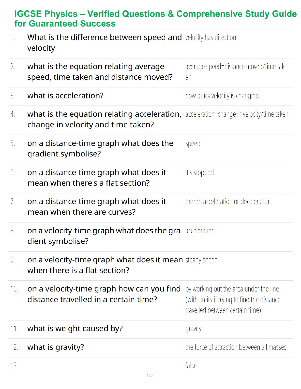 Master the IGCSE Physics curriculum and ace your exams with our newly updated 2025/2026 comprehensive study guide. This essential resource features a curated list of verified questions and concise, accurate answers on foundational topics like motion, forces, and graphical analysis. Designed to ensure you pass on your first attempt, this guide simplifies complex concepts, builds your confidence, and provides the targeted practice you need to avoid resits and achieve guaranteed success.