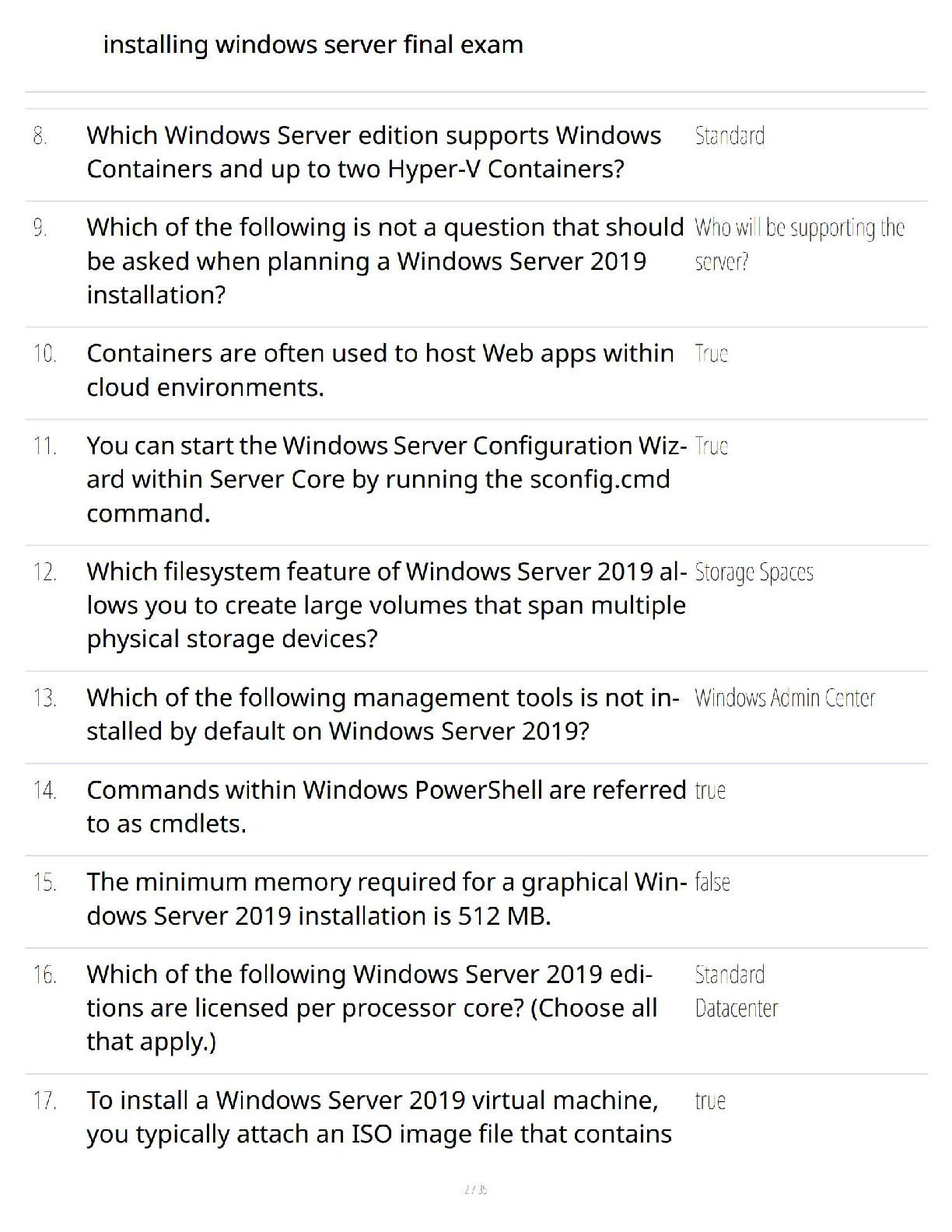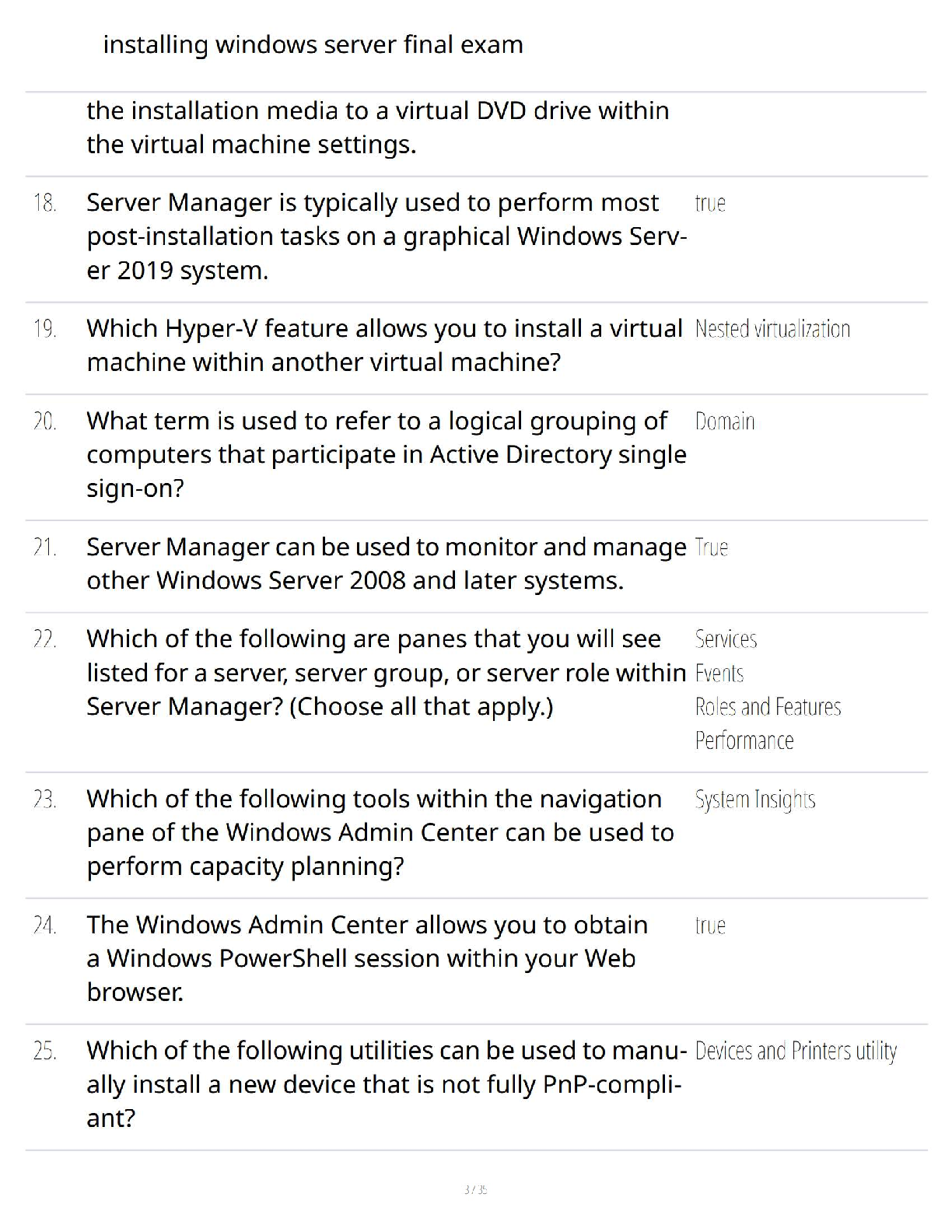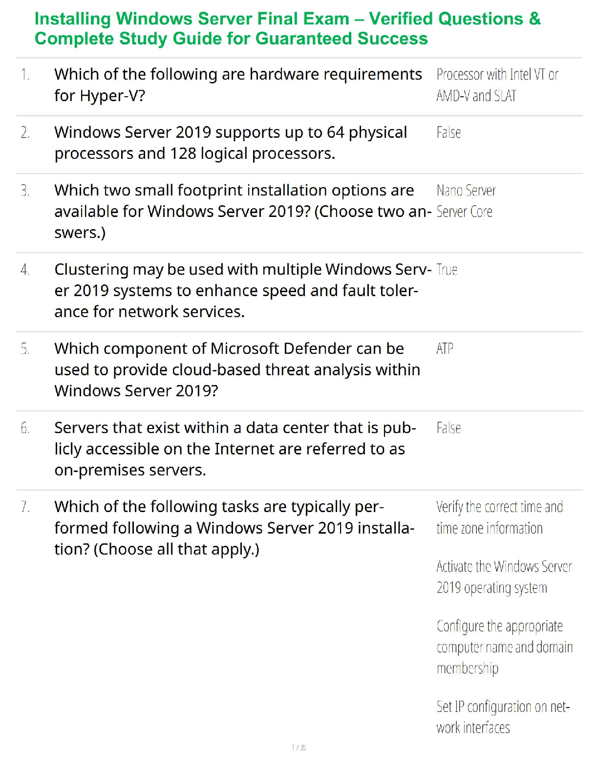 Ace your "Installing Windows Server" final exam with this comprehensive test bank, featuring a complete set of verified questions and detailed answers. This essential study guide covers all key topics, including hardware requirements for Hyper-V, Windows Server 2019 configurations, installation options like Nano Server and Server Core, clustering for high availability, and Microsoft Defender security. Master the post-installation tasks and core concepts to ensure you pass your exam on the first try and avoid costly resits. This is the ultimate resource for guaranteed success in your Windows Server course.