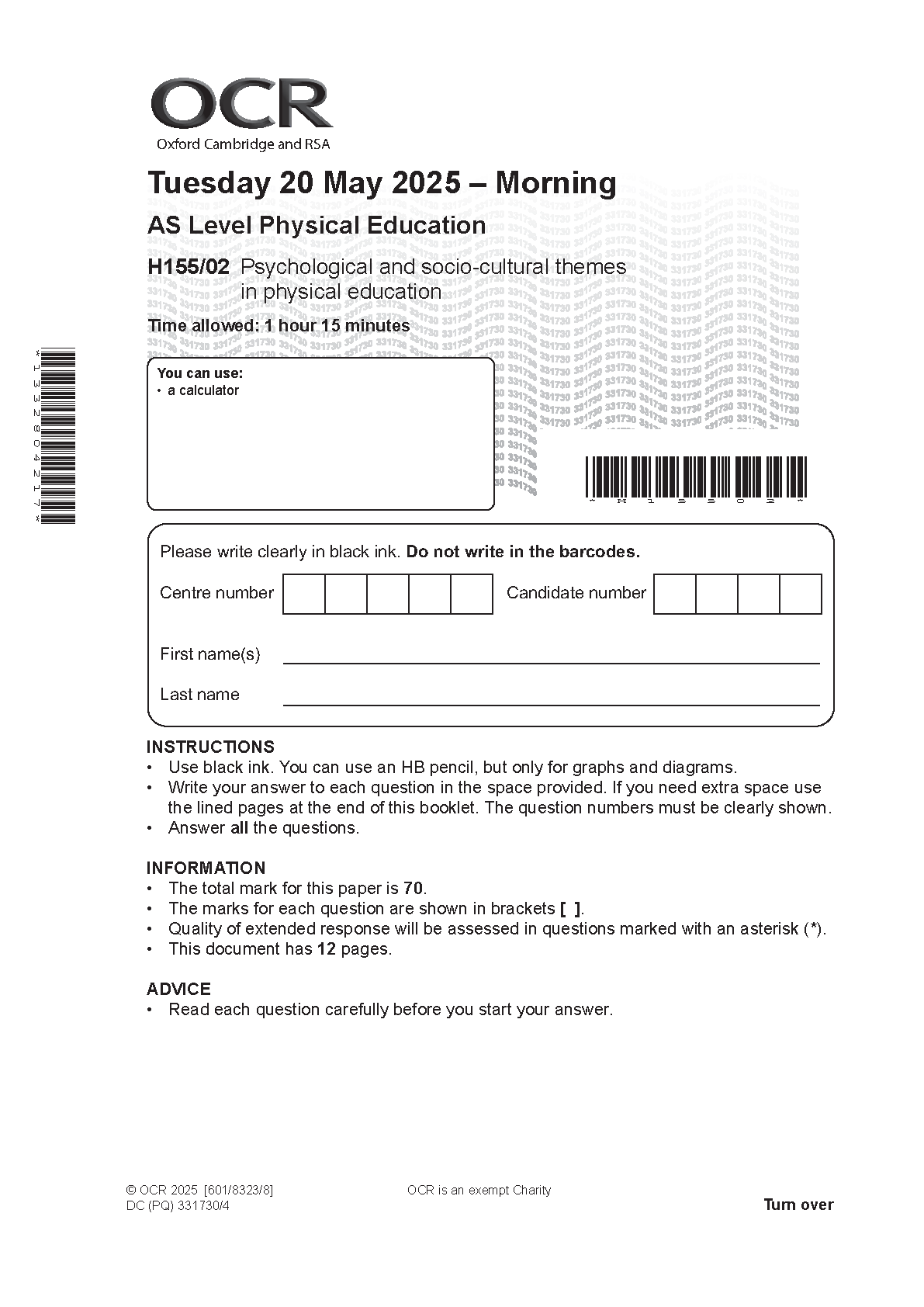 2025 OCR AS Level Physical Education Paper 2 (H155/02: Psychlogical and socio-cultural themes in physical education)