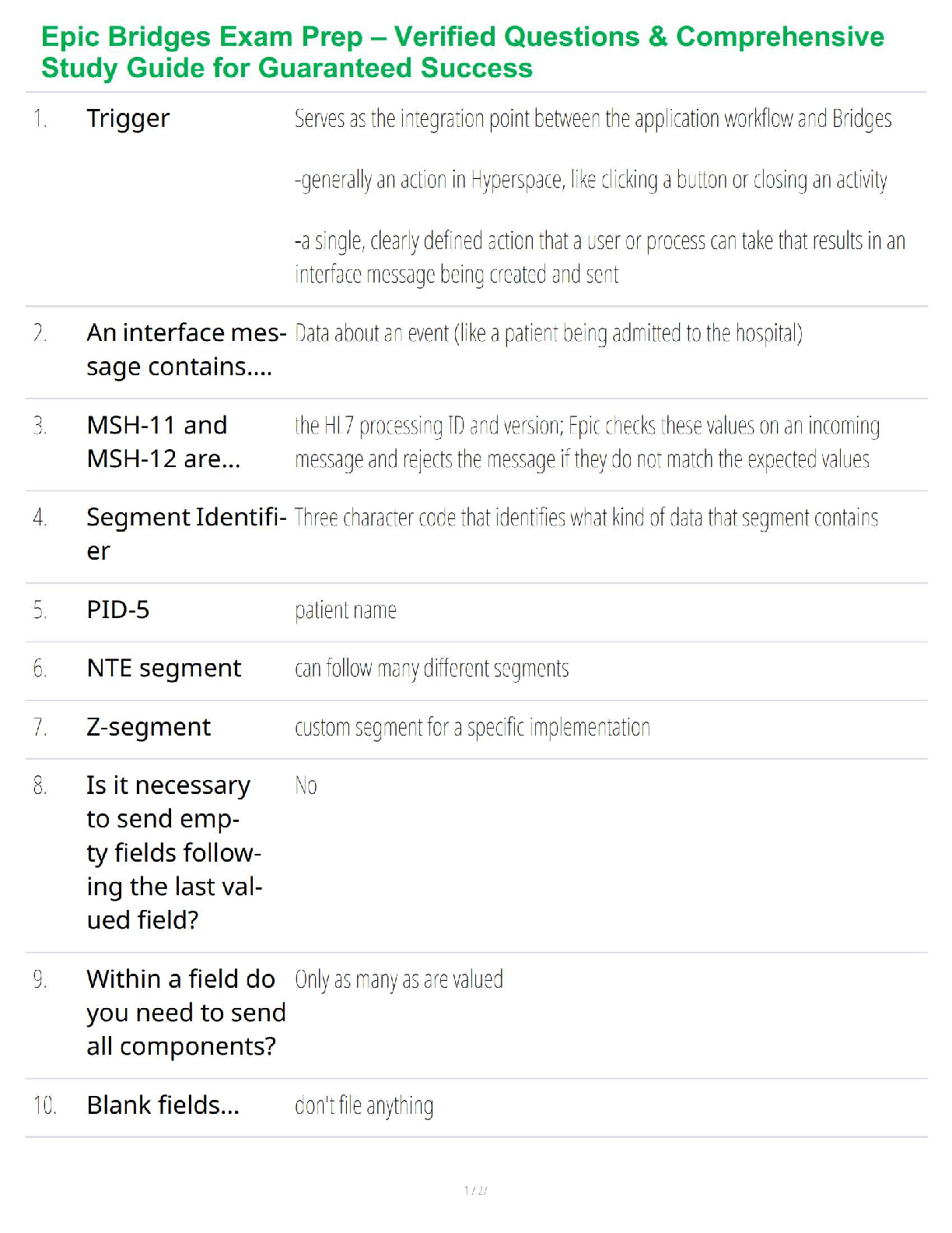 Achieve a first-time pass on your Epic Bridges Certification Exam with our expertly crafted 2025/2026 study resource. This comprehensive guide is packed with verified questions and detailed, easy-to-understand answers covering all critical exam topics. Master key concepts including interface triggers, HL7 message structure, segment identifiers (MSH, PID, NTE), and data field rules. Our proven Q&A format is the most effective way to prepare, building your confidence and knowledge to guarantee success. Avoid the stress and cost of a resit by using this essential tool for your Epic Bridges exam preparation.