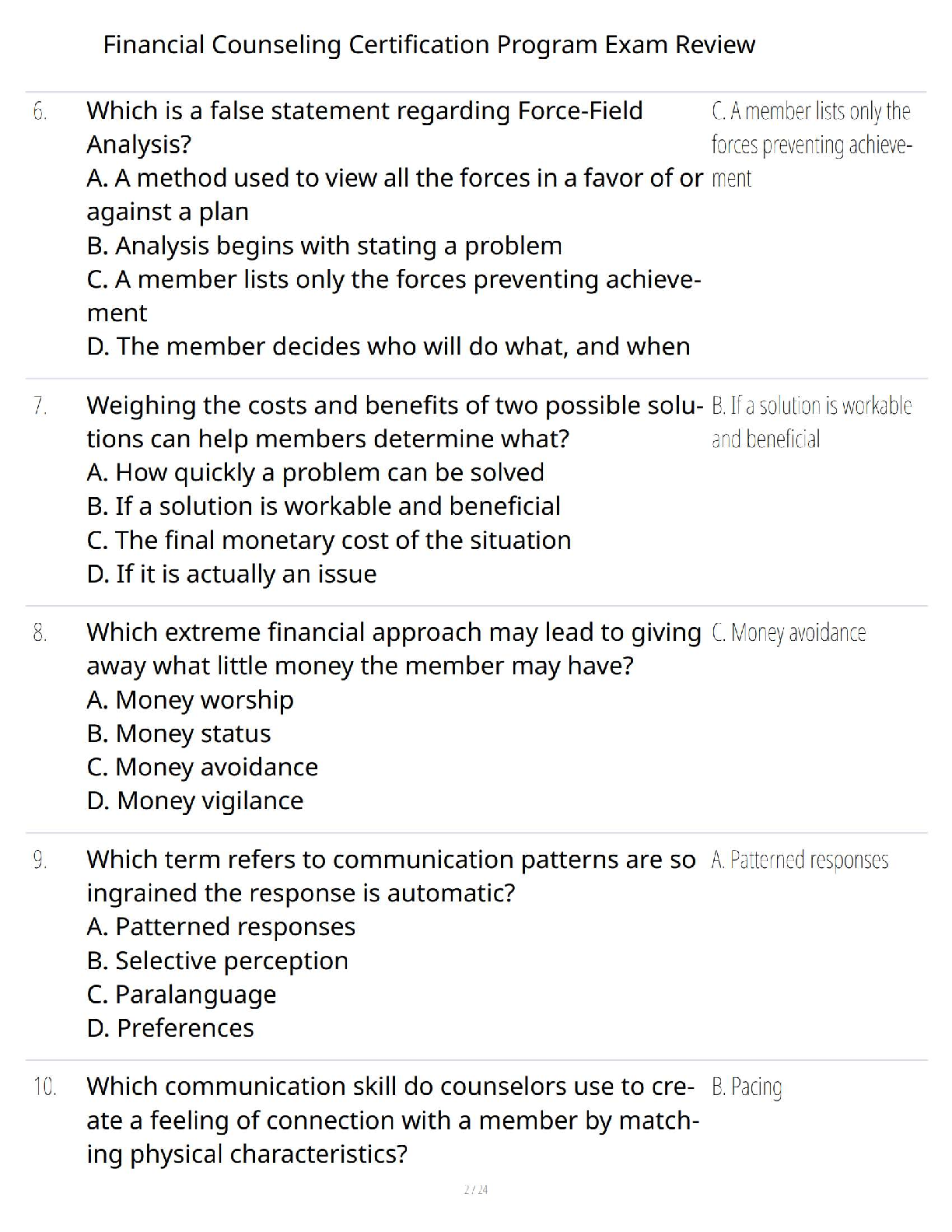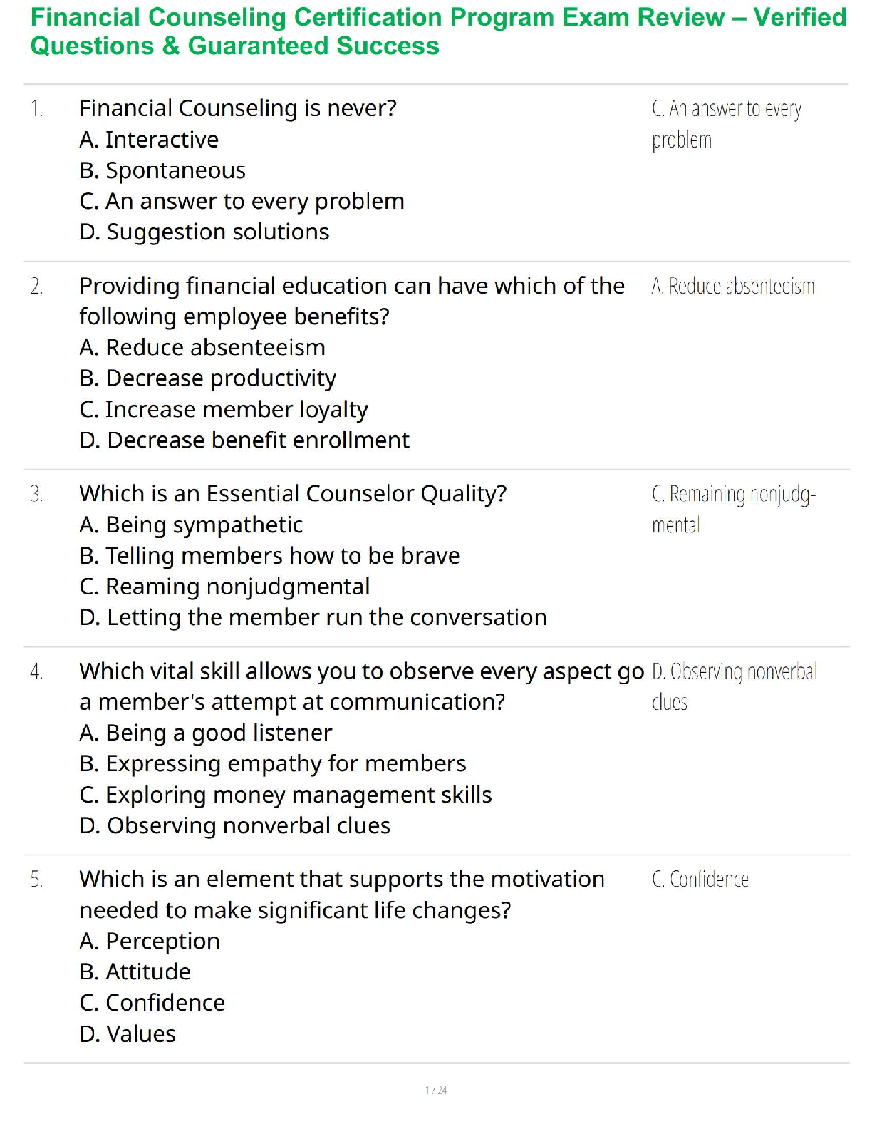Ace your Financial Counseling Certification Program exam with our comprehensive test bank. This essential study guide features a complete collection of verified exam questions and detailed answers, covering all critical topics you'll face. From fundamental principles of financial counseling to essential counselor qualities and effective communication strategies, this resource is designed to ensure you're fully prepared. Master the material, boost your confidence, and achieve guaranteed success on your certification journey.
