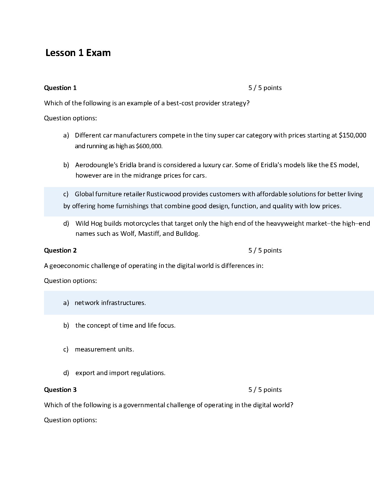 Master your strategic management course with the authentic Test Bank for 'Crafting and Executing Strategy: The Quest for Competitive Advantage,' 24th Edition. Authored by renowned experts Thompson, Peteraf, Gamble, and Strickland, this extensive resource features a wide array of exam-style questions, including multiple-choice and short-answer, all accompanied by verified, correct answers. This study guide is designed to cover every crucial topic from the textbook, such as best-cost provider strategies and the geoeconomic challenges of the digital age. It is the perfect tool to deepen your understanding, prepare effectively for exams, and secure a high grade in your strategic management course.