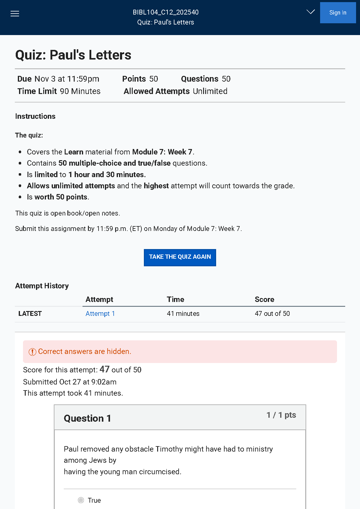 Liberty University BIBL 104 Week 7 Quiz - Paul's Letters: Test Bank with Correct Answers
