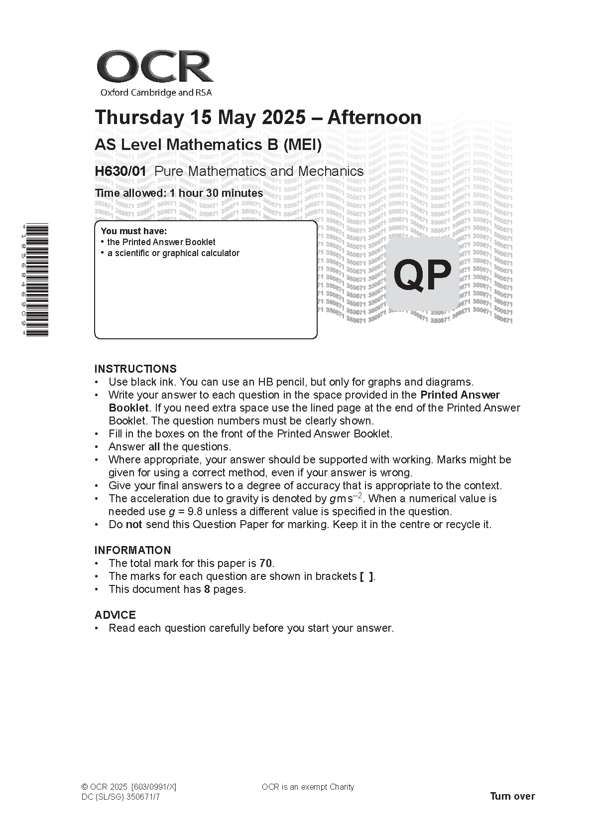 2025 OCR AS Level Mathematics B (MEI) Paper 1 (H630/01: Pure Mathematics and Mechanics)