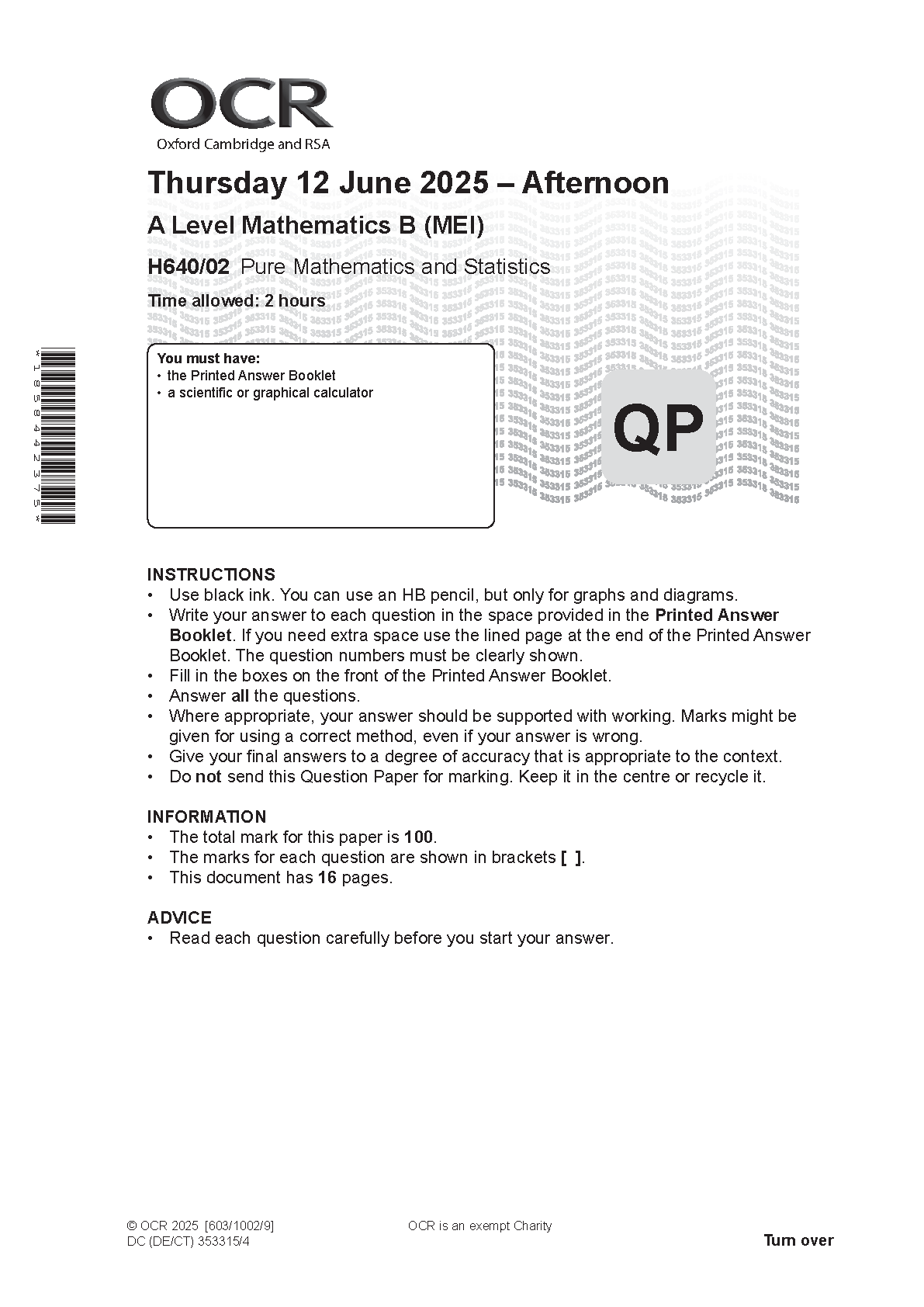 2025 OCR A Level Mathematics B (MEI) Paper 2 (H640/02: Pure Mathematics and Statistics)