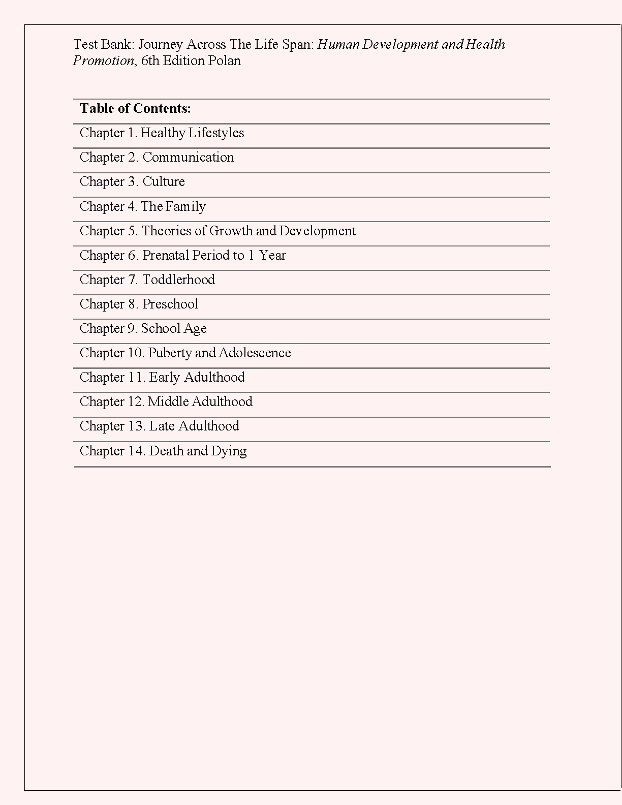 Test Bank for Journey Across the Life Span: Human Development and Health Promotion, 7th Edition by Elaine U. Polan & Daphne R. Taylor