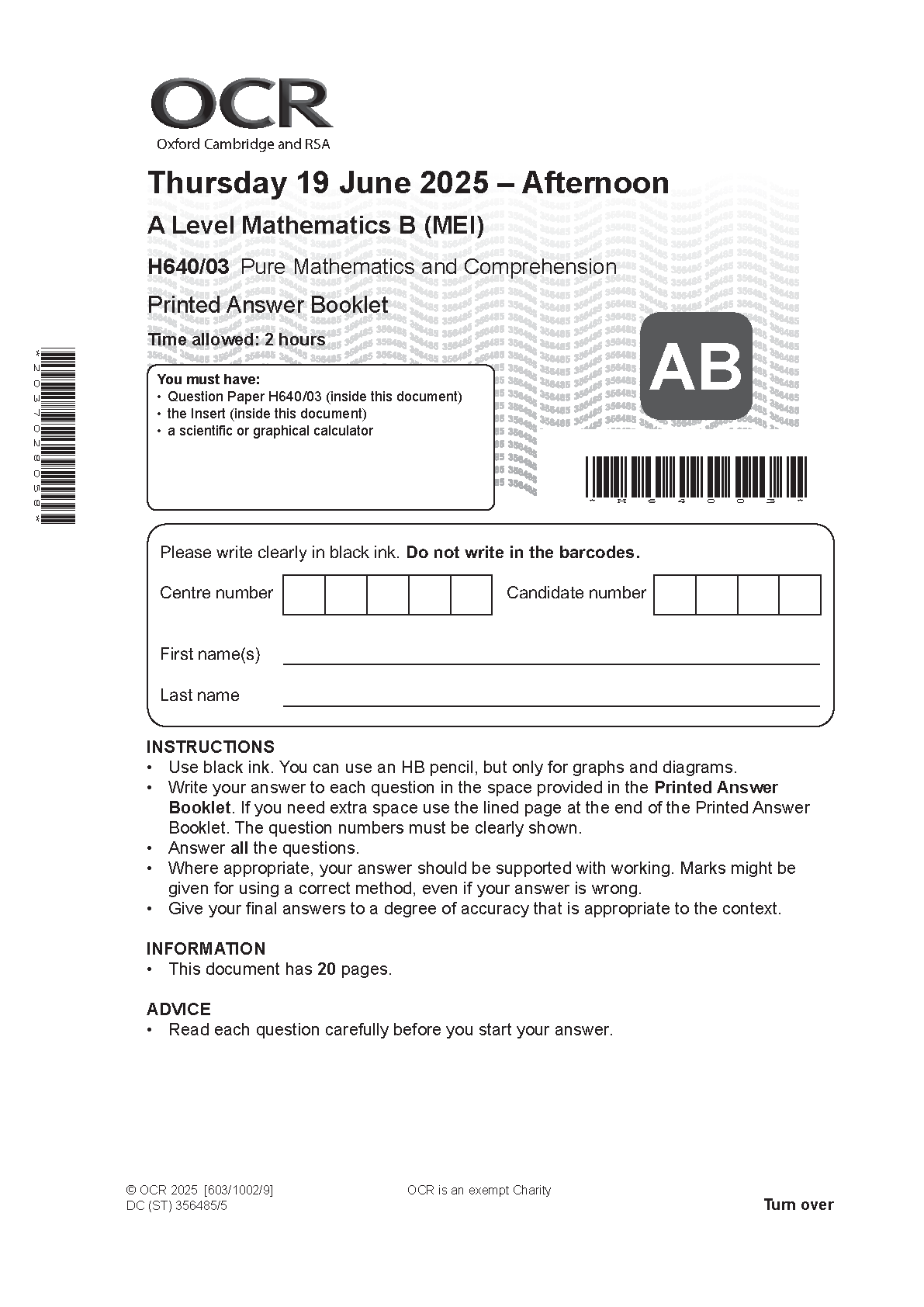 2025 OCR A Level Mathematics B (MEI) Printed Answer Booklet Paper 3 (H640/03 Pure Mathematics and Comprehension)