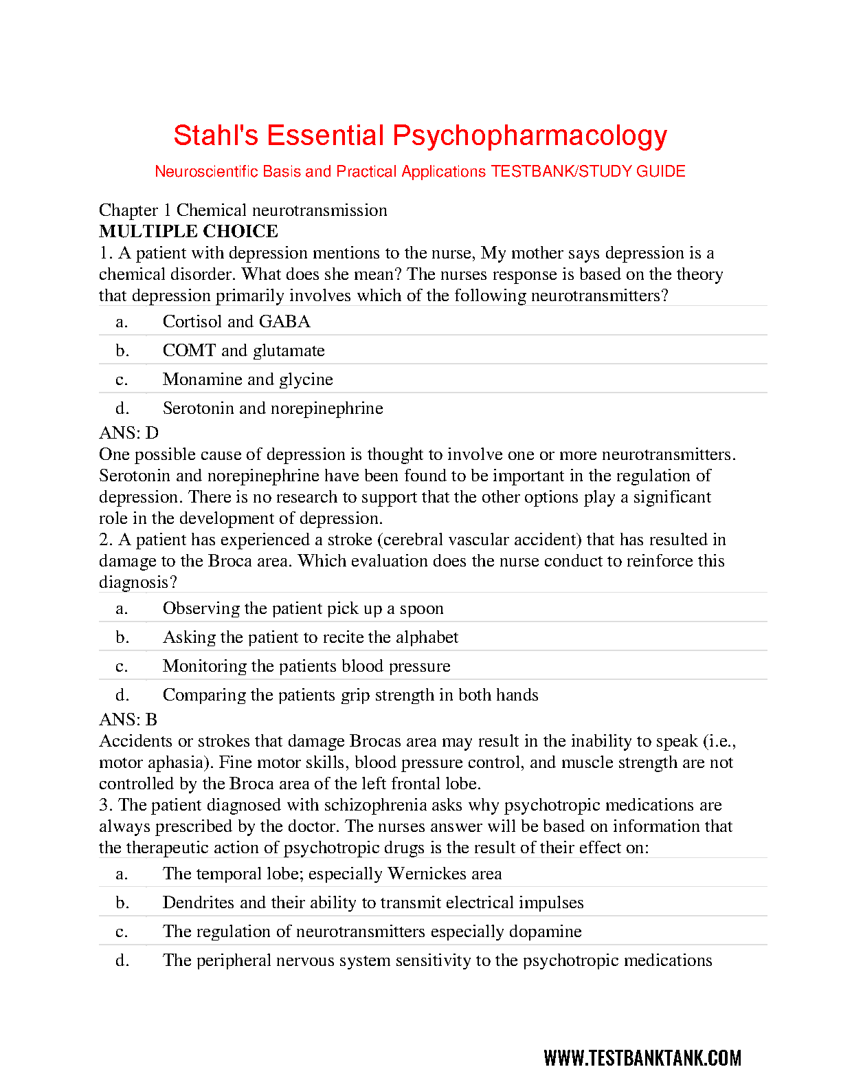 Unlock your full potential and excel in your psychopharmacology course with the complete test bank for Stahl's Essential Psychopharmacology: Neuroscientific Basis and Practical Applications, 5th Edition by Stephen M. Stahl. This essential study resource provides an extensive collection of multiple-choice questions, complete with detailed answers and rationales for every chapter. Designed to deepen your understanding of complex topics like chemical neurotransmission and the practical application of psychotropic medications, this test bank is your ultimate tool for effective exam preparation. Master the material, boost your confidence, and achieve top grades by using this authentic and comprehensive guide.