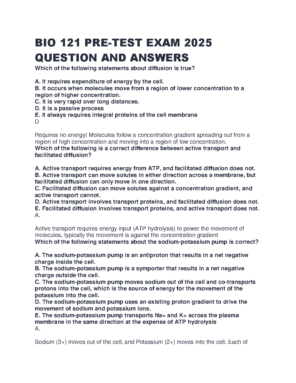 Master the fundamentals of cell biology with our comprehensive BIO 121 Pre-Test Exam for the 2025-2026 academic year. This essential study guide features a complete set of questions with detailed, verified answers covering crucial topics such as diffusion, active transport, facilitated diffusion, and the sodium-potassium pump. Designed to mirror actual exam questions, this resource is your key to understanding complex concepts, boosting your confidence, and acing your exam without needing a resit.