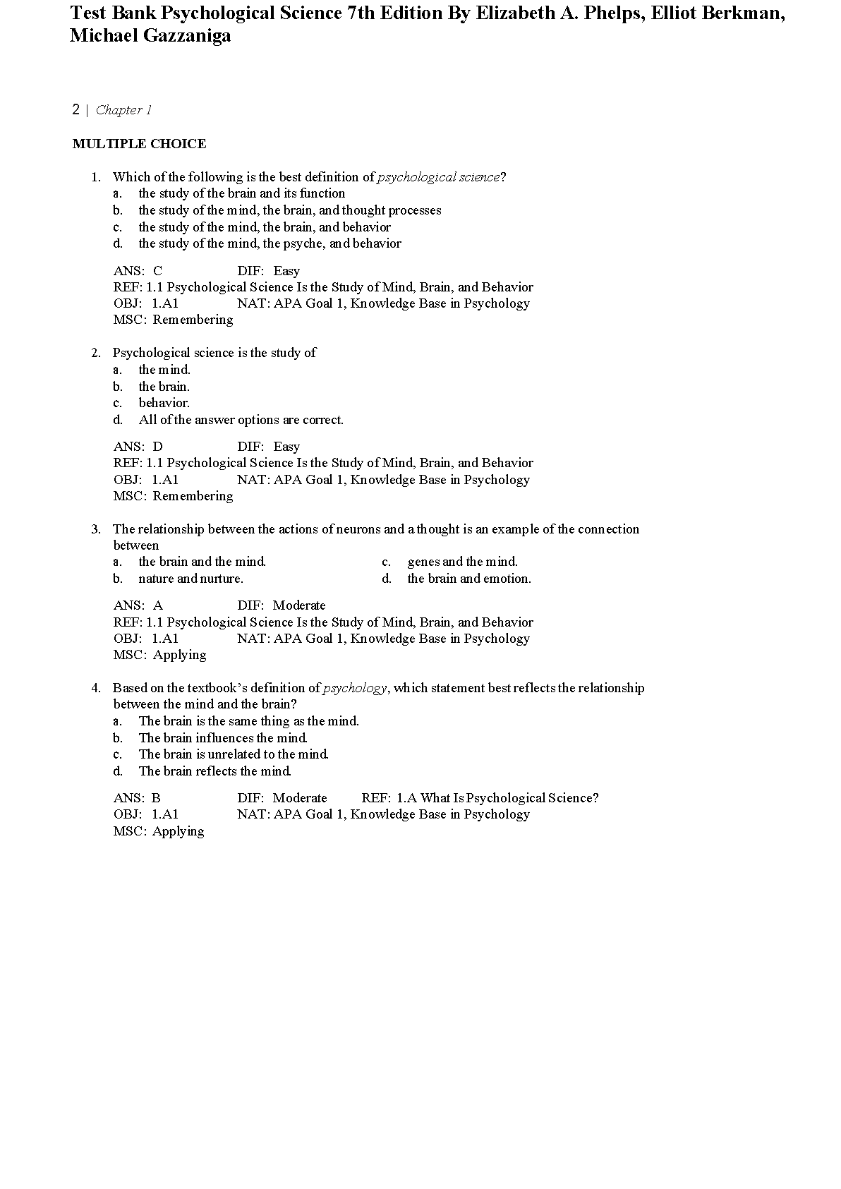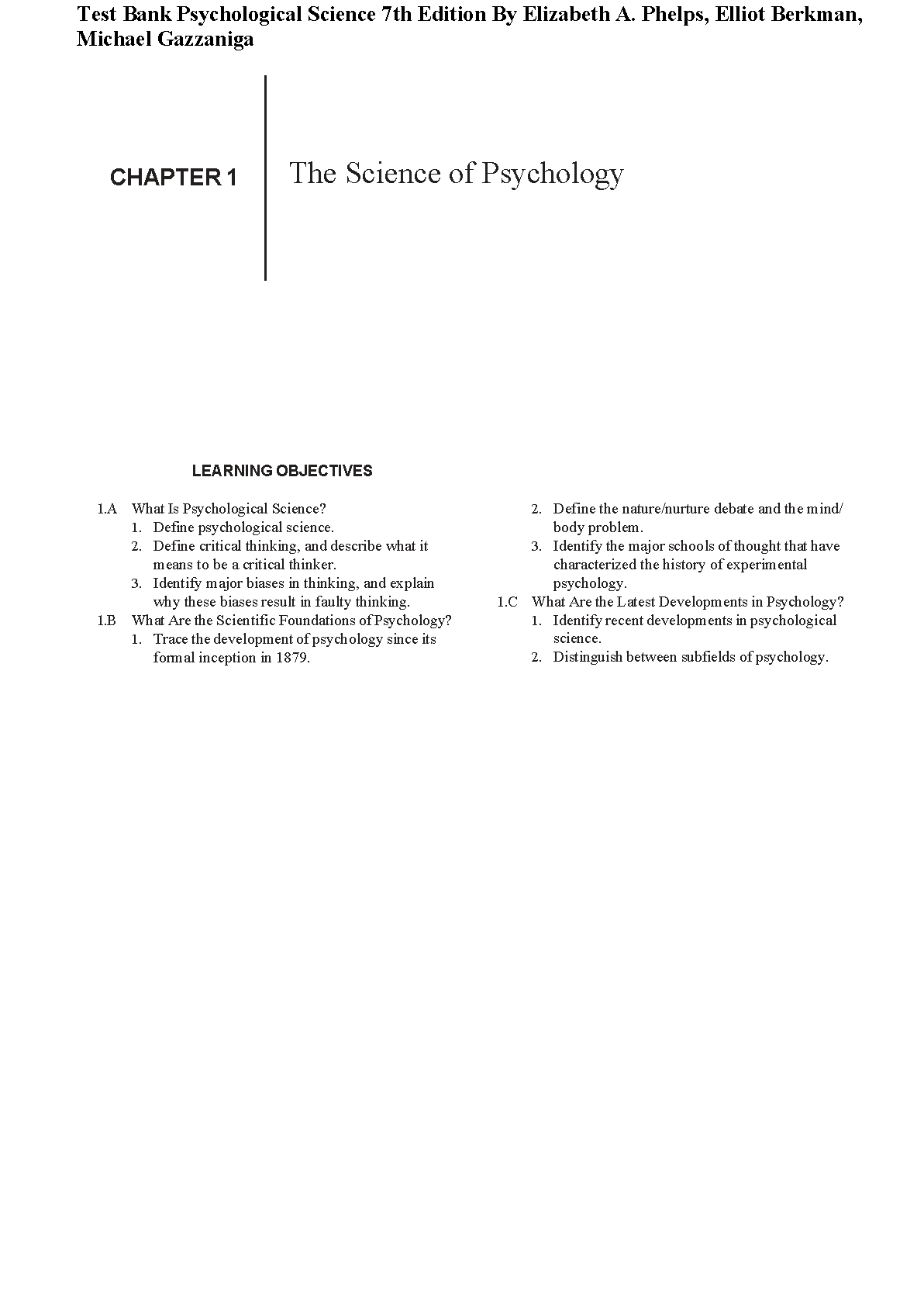 Test Bank for Psychological Science, 7th Edition, by Elizabeth A. Phelps, Elliot T. Berkman, and Michael S. Gazzaniga