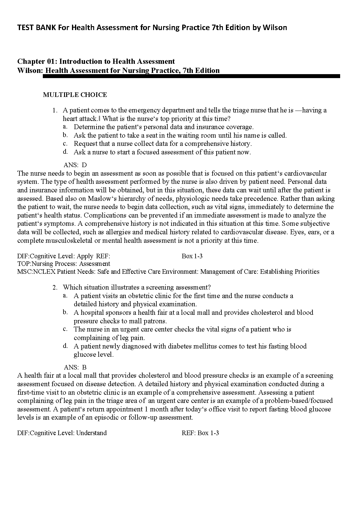 Unlock your full potential and excel in your nursing studies with the official Test Bank for 'Health Assessment for Nursing Practice, 7th Edition' by Wilson and Giddens. This essential study aid provides a comprehensive collection of exam-style questions, complete with detailed answers and rationales, covering every chapter of the textbook. Perfect for preparing for quizzes and exams, this test bank helps you master key concepts, identify areas for improvement, and build confidence in your assessment skills. Download now and take the first step towards acing your health assessment course.