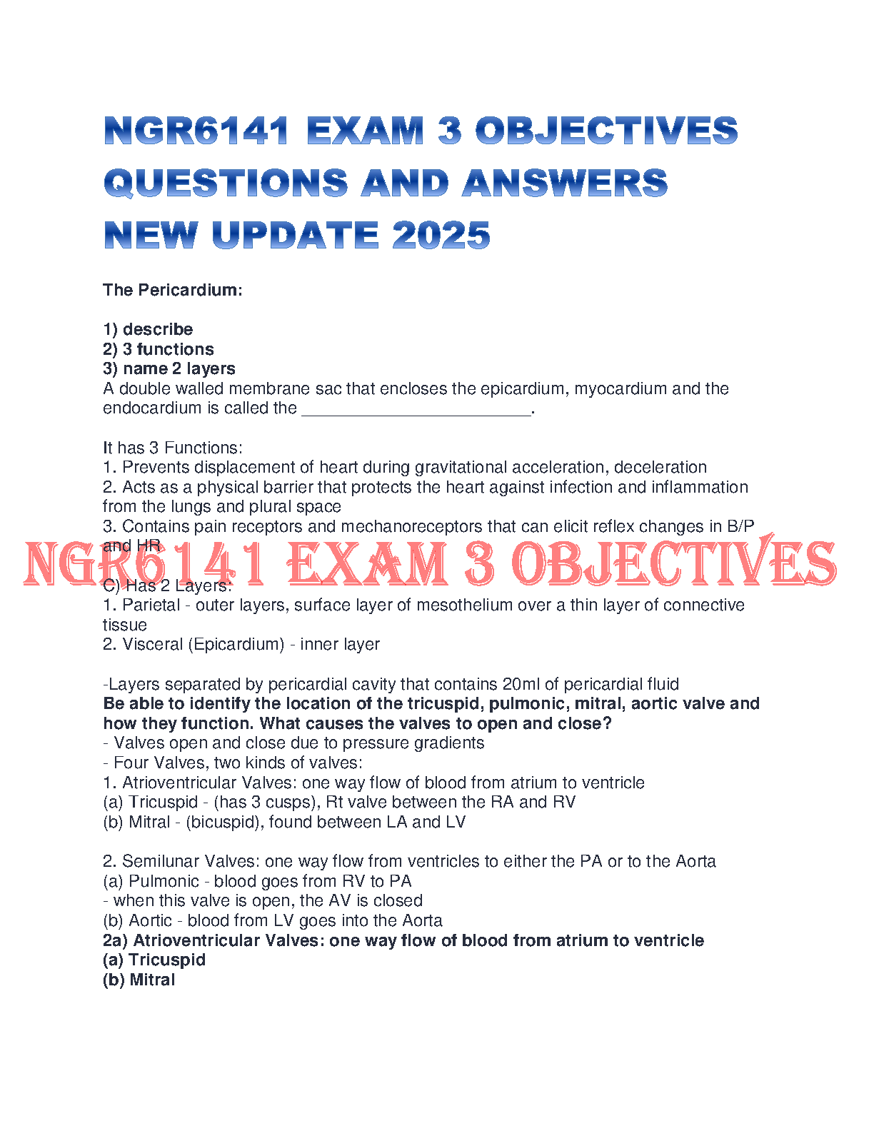 Unlock success in your NGR6141 Exam 3 with this meticulously crafted study guide. This resource provides a detailed breakdown of all exam objectives, featuring a comprehensive set of questions and expertly verified answers for the 2025/2026 academic year. Master crucial concepts including the anatomy and physiology of the pericardium, the functions and locations of all four heart valves (tricuspid, mitral, pulmonic, and aortic), and the pressure dynamics that govern their operation. Designed to clarify complex topics and boost your confidence, this guide is your ultimate tool to ace the exam on your first attempt and avoid costly resits. Get the edge you need to excel in your Advanced Pathophysiology course!