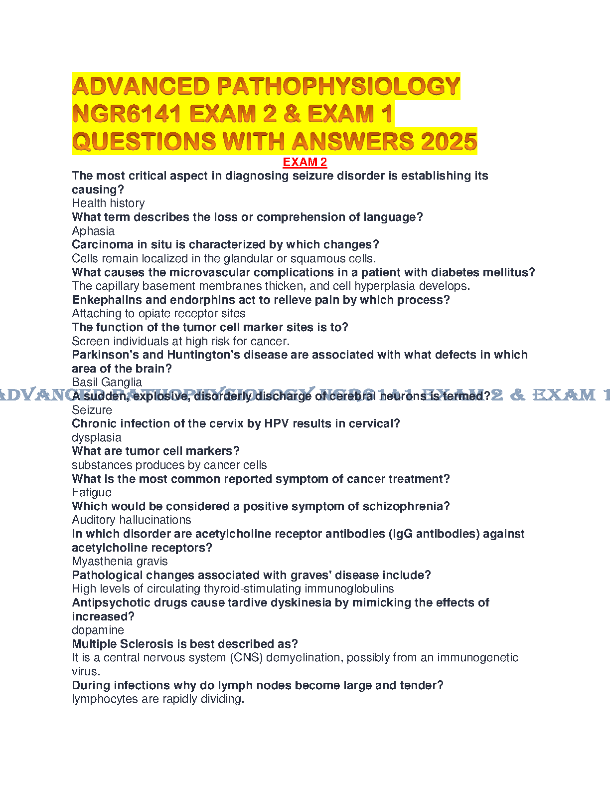 Instantly download the complete Test Bank for NGR6141 Advanced Pathophysiology, covering both Exam 1 and Exam 2. This 2025 edition provides a comprehensive collection of questions and meticulously verified answers, designed to help you master the course material and excel in your exams. Covering critical topics such as neurological disorders, cellular changes, immunology, and endocrine pathology, this guide is your key to understanding complex concepts and passing on your first attempt. Perfect for nursing students looking to streamline their study process and achieve academic success.