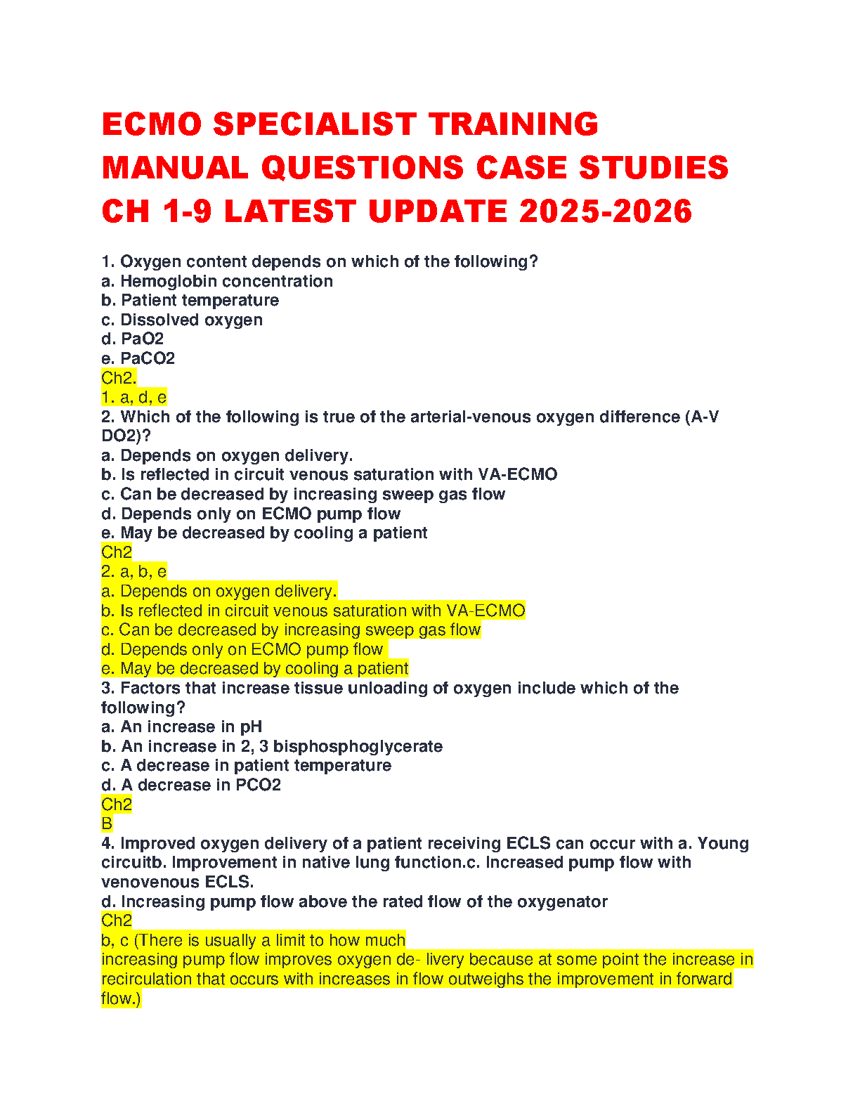 Get ready to master the fundamentals of extracorporeal life support with our comprehensive Test Bank for the ECMO Specialist Training Manual, 5th Edition, edited by Heidi J. Dalton and Robert H. Bartlett. This essential study resource, updated for the 2025-2026 curriculum, provides an extensive collection of questions, detailed answers, and insightful case studies covering Chapters 1-9. Perfect for healthcare professionals preparing for their ECMO certification, this guide helps you solidify your understanding of complex concepts, from oxygen delivery to circuit management. Ace your exams and advance your critical care career with this must-have training companion.