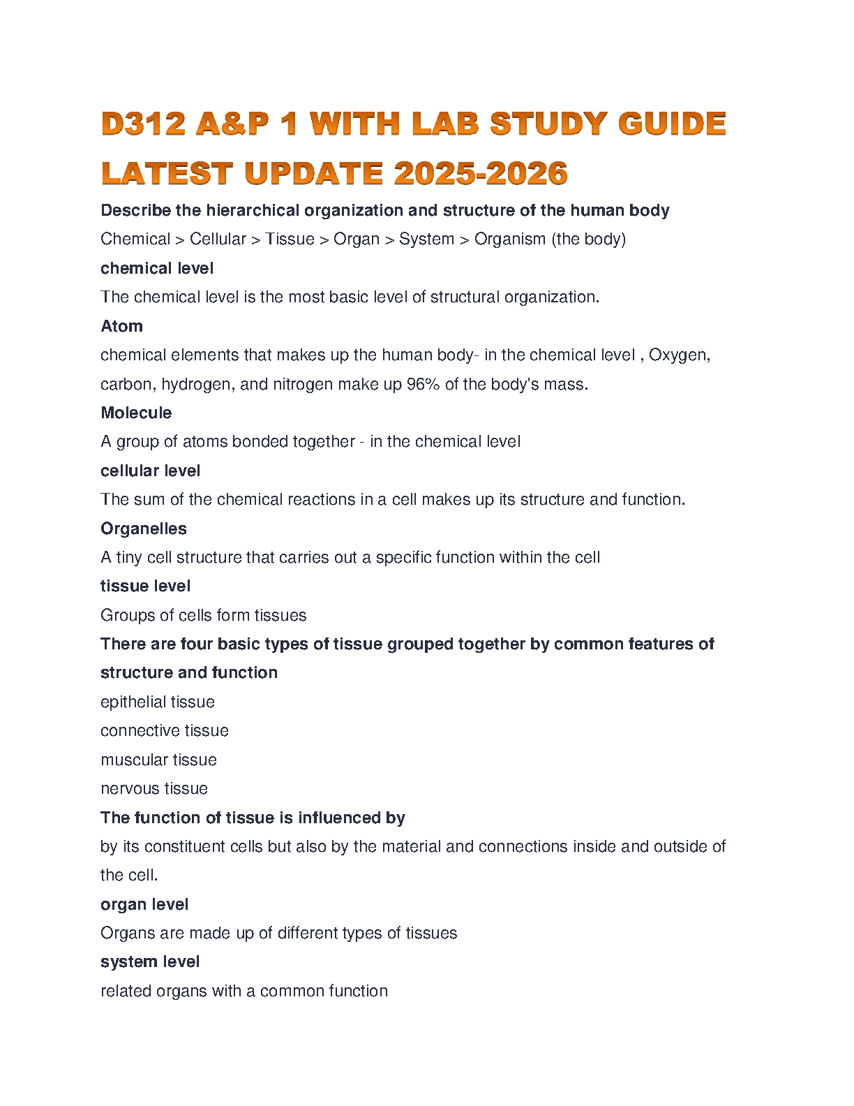 Avoid resits and master the fundamentals of Anatomy and Physiology with our latest study guide tailored for the WGU D312 A&P 1 with Lab course. Fully updated for the 2025-2026 academic year, this guide provides in-depth exam elaborations, breaking down the complex hierarchical organization of the human body. It covers everything from the chemical and cellular levels to tissues, organs, and systems, ensuring you have a solid understanding. This resource is expertly designed to help you pass your exams on the first attempt.