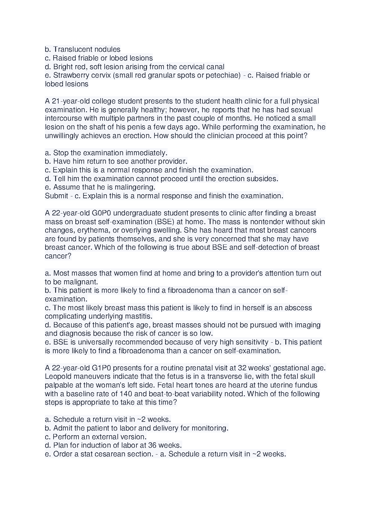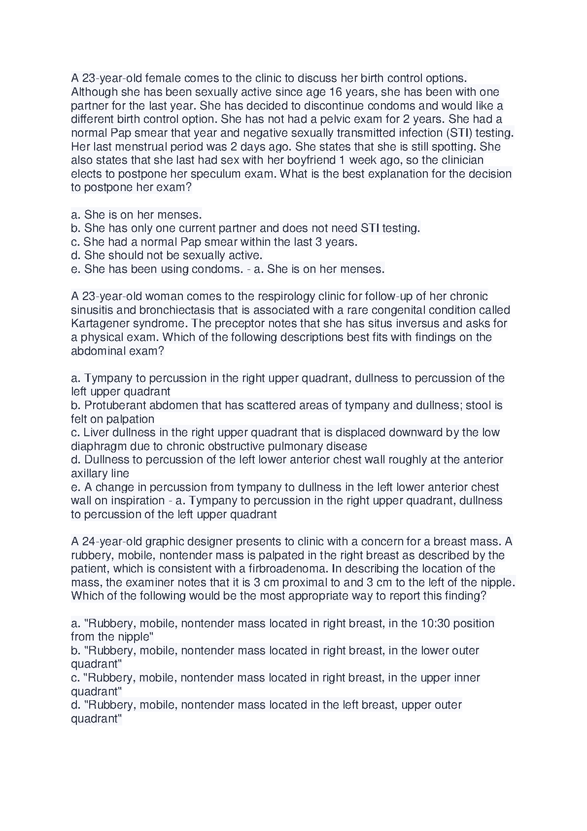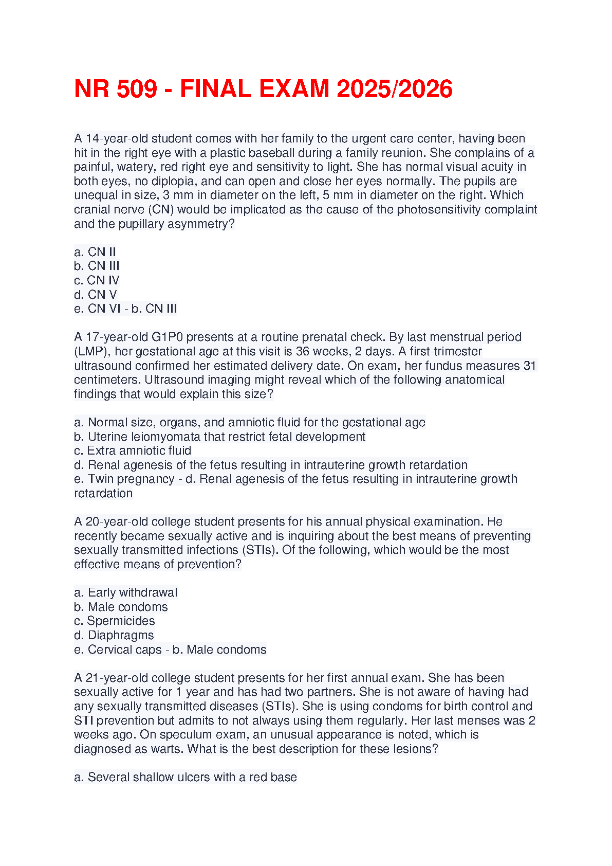 Prepare to ace your NR 509 Final Exam with our comprehensive 2025/2026 test bank! This study resource is expertly aligned with 'Advanced Health Assessment and Diagnostic Reasoning, 4th Edition' by Dains, Baumann, & Scheibel. It features a wide range of multiple-choice questions covering key topics in advanced physical assessment, from cranial nerve evaluation to prenatal care and STI prevention, just like those you'll see on the real exam. Each question is designed to test your clinical reasoning and ensure you master the material needed to pass on your first attempt. Stop stressing and start studying smart with this essential guide for NR 509 students.