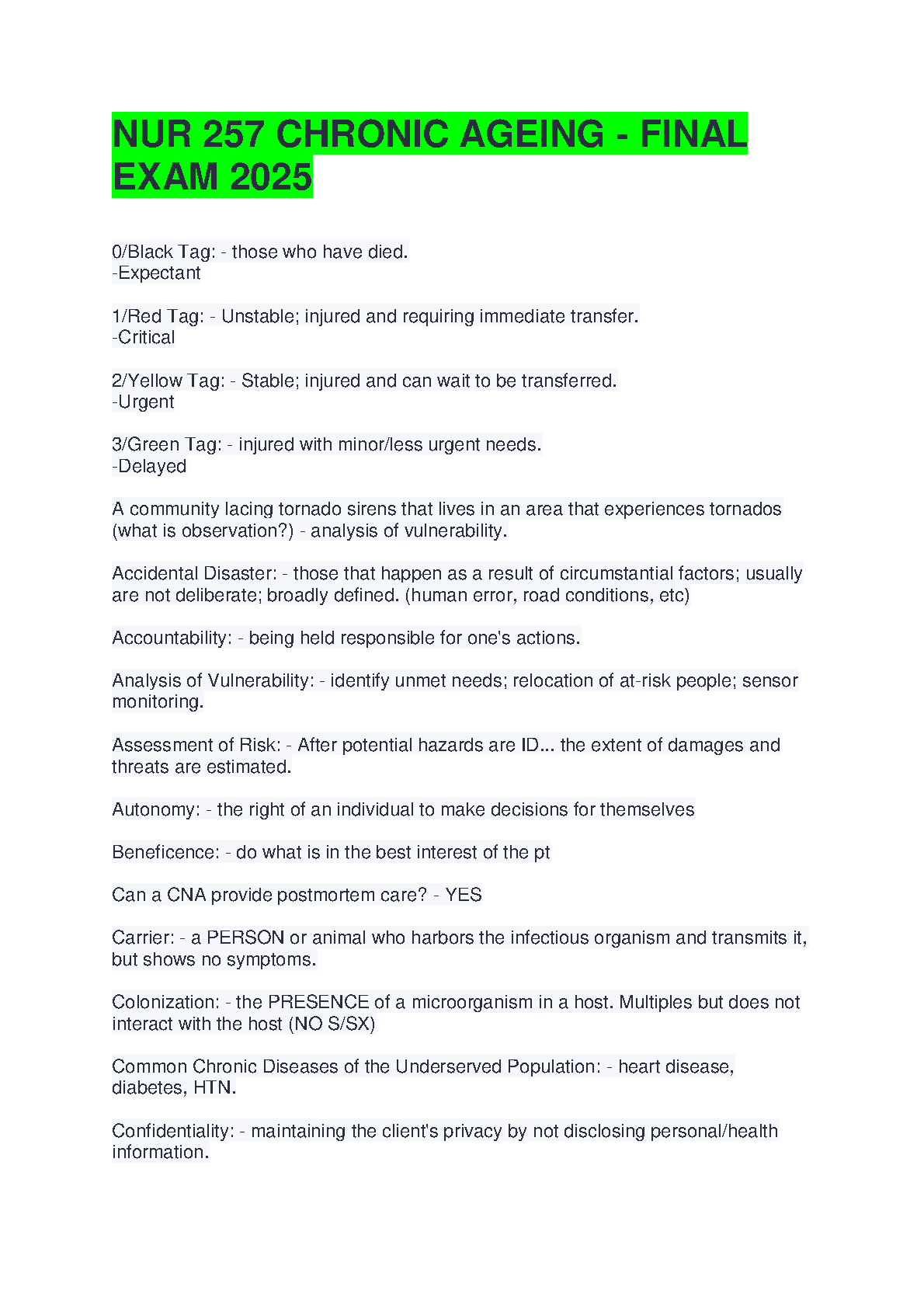 Struggling with NUR 257 Chronic Ageing? Your ultimate study partner for the 2025/2026 academic year is here! This comprehensive guide covers all essential topics for your final exam, including disaster triage tagging, vulnerability assessment, ethical principles like autonomy and beneficence, and key concepts in chronic disease management for older adults. Designed to help you master the material efficiently, this resource is your key to avoiding resits and passing the NUR 257 final exam with confidence on your first try.