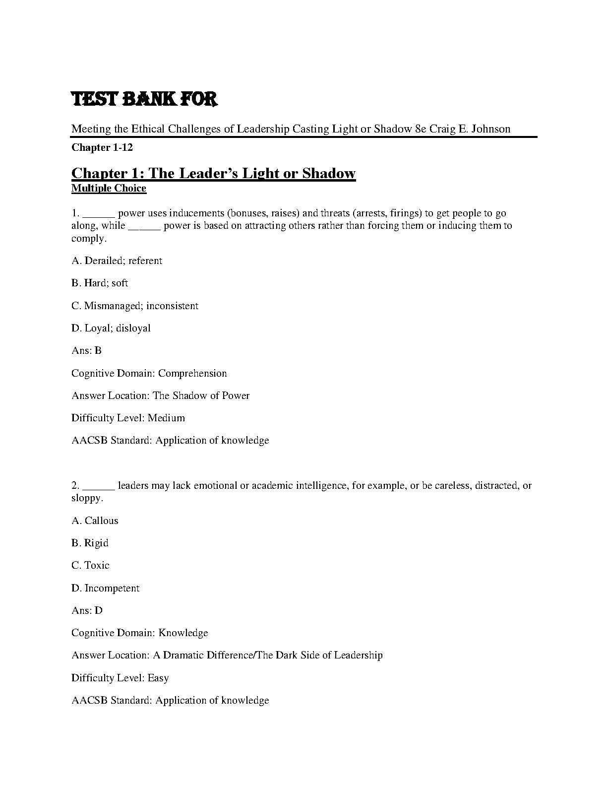 Test Bank for Meeting the Ethical Challenges of Leadership: Casting Light or Shadow, 8th Edition by Craig E. Johnson