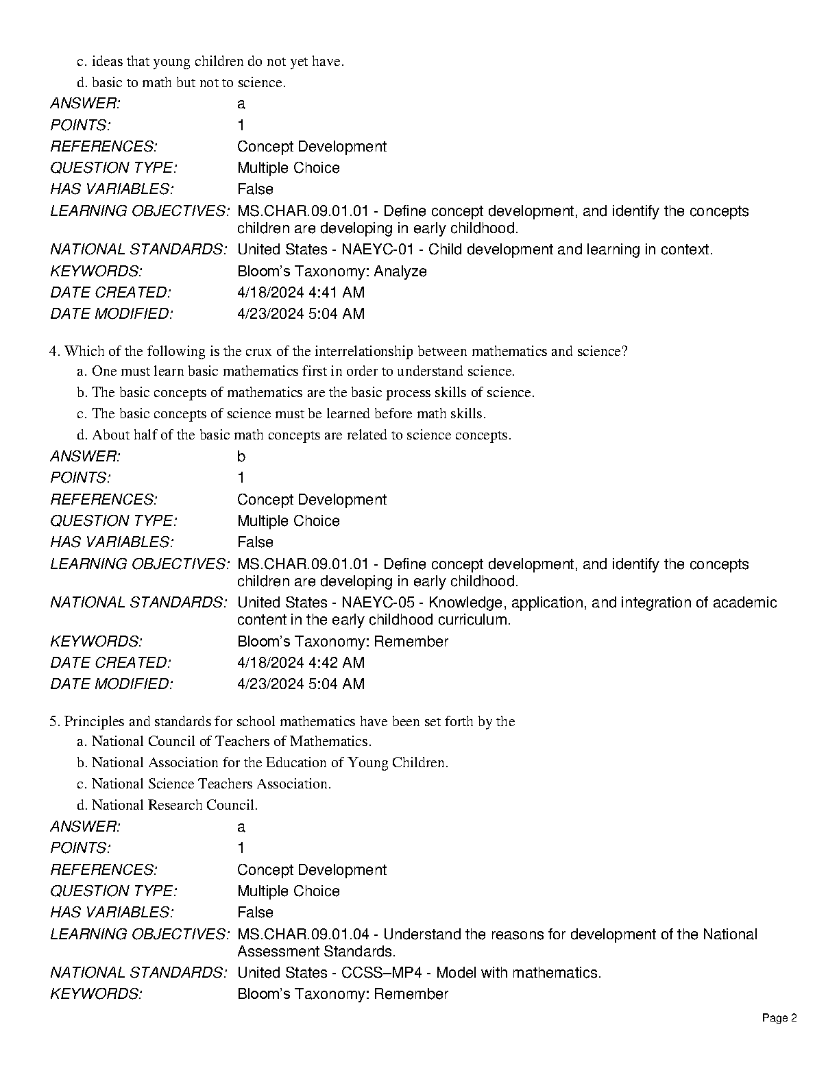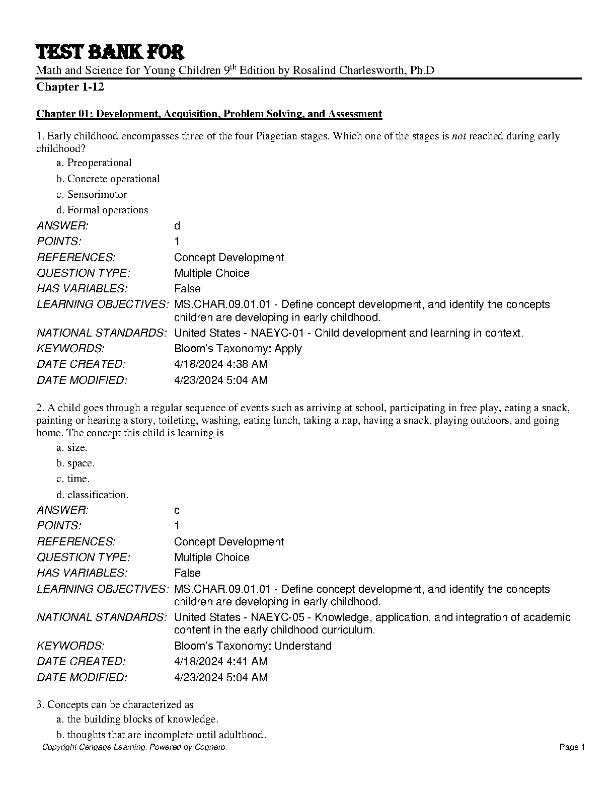 Gain an academic edge with the complete Test Bank for 'Math and Science for Young Children, 9th Edition,' authored by Charlesworth, Lind, and Kile. This invaluable resource covers all 12 chapters and is packed with exam-style questions, complete with verified answers and detailed rationales. It's the ultimate study guide designed to help you master course concepts, effectively prepare for tests, and excel in your early childhood education studies. Instantly downloadable to start your preparation right away.
