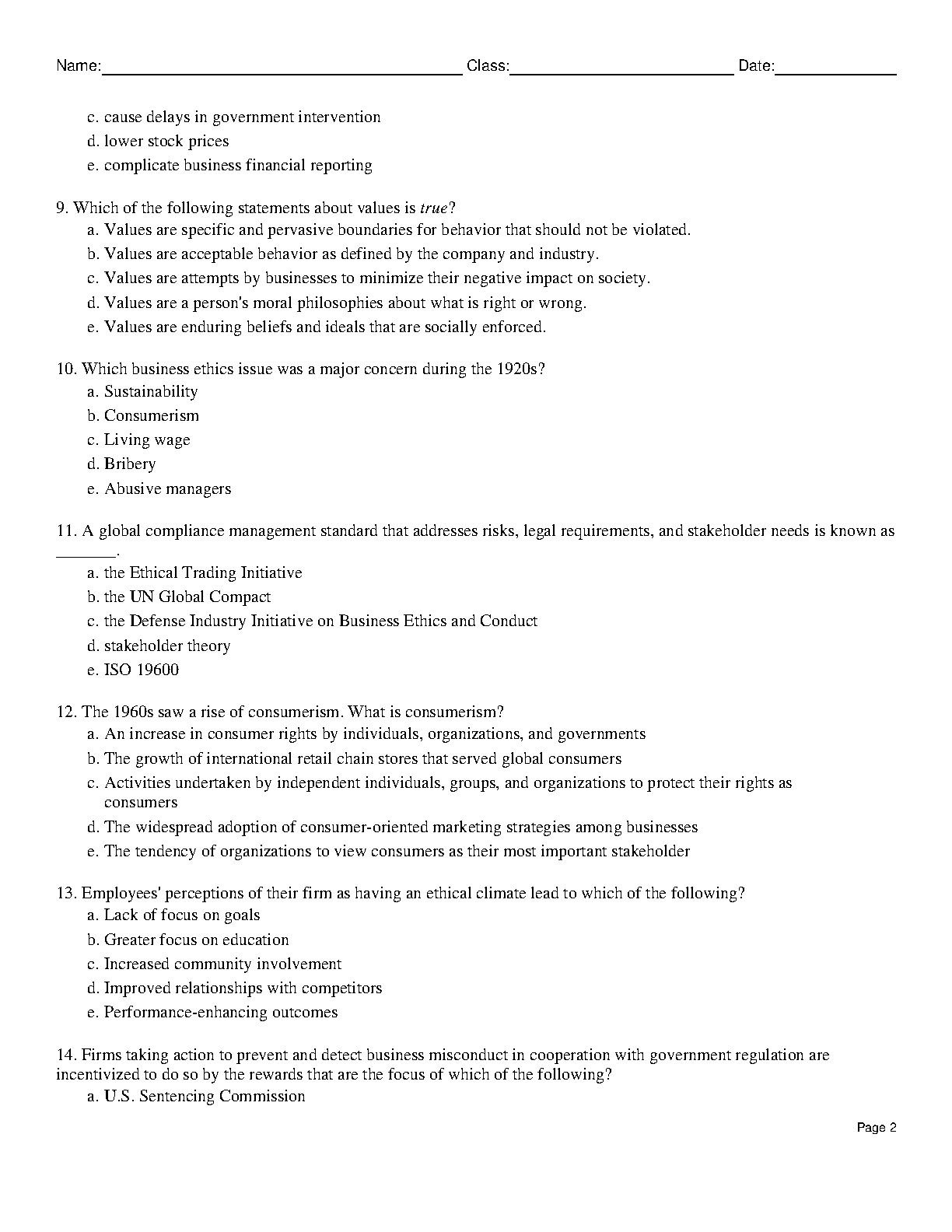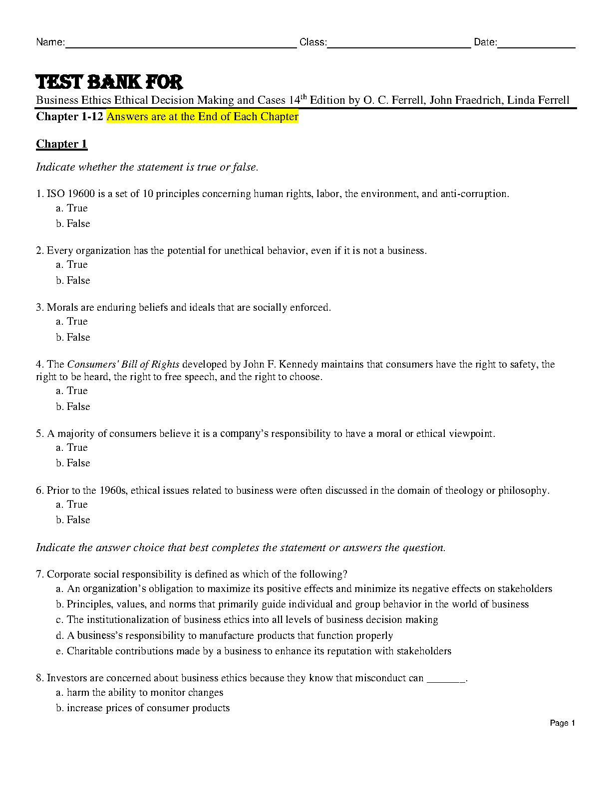 Test Bank for Business Ethics: Ethical Decision Making and Cases, 14th Edition by O. C. Ferrell, John Fraedrich, and Linda Ferrell