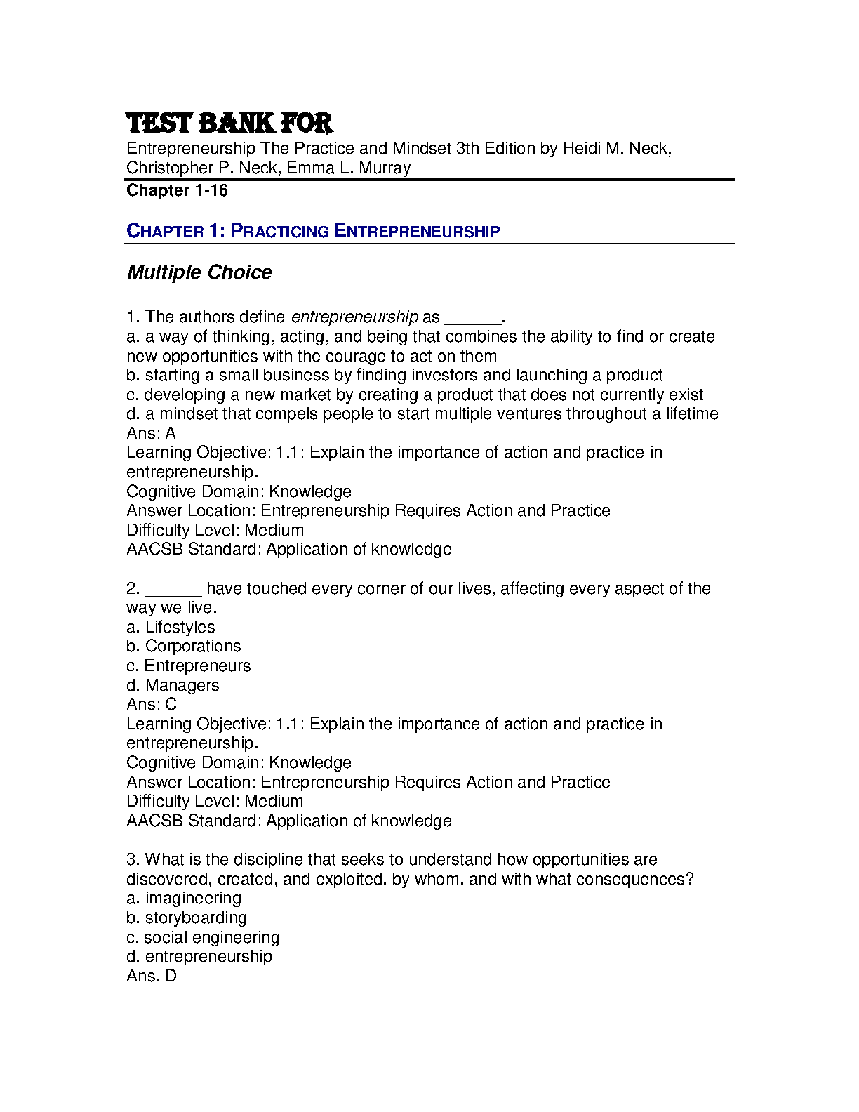Test Bank for Entrepreneurship: The Practice and Mindset, 3rd Edition by Heidi M. Neck, Christopher P. Neck & Emma L. Murray