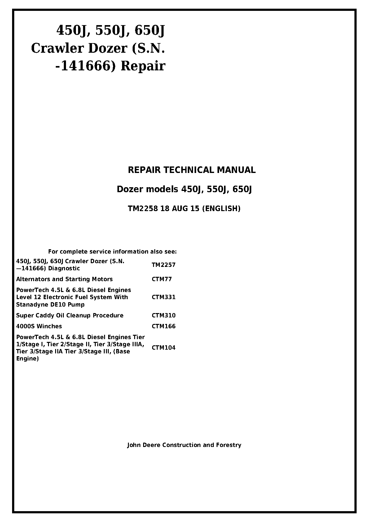 Gain instant access to the complete and official Repair Technical Manual TM2258 for John Deere 450J, 550J, and 650J Crawler Dozers (for serial numbers up to 141666). This comprehensive 2015 edition, published by John Deere Construction and Forestry, provides detailed, step-by-step instructions for every aspect of repair, service, and maintenance. From engine diagnostics to hydraulic system overhauls, this manual is the ultimate resource for professional technicians and equipment owners to ensure precise, efficient, and reliable repairs. Download now to get the factory-approved information you need to keep your dozer running at peak performance.