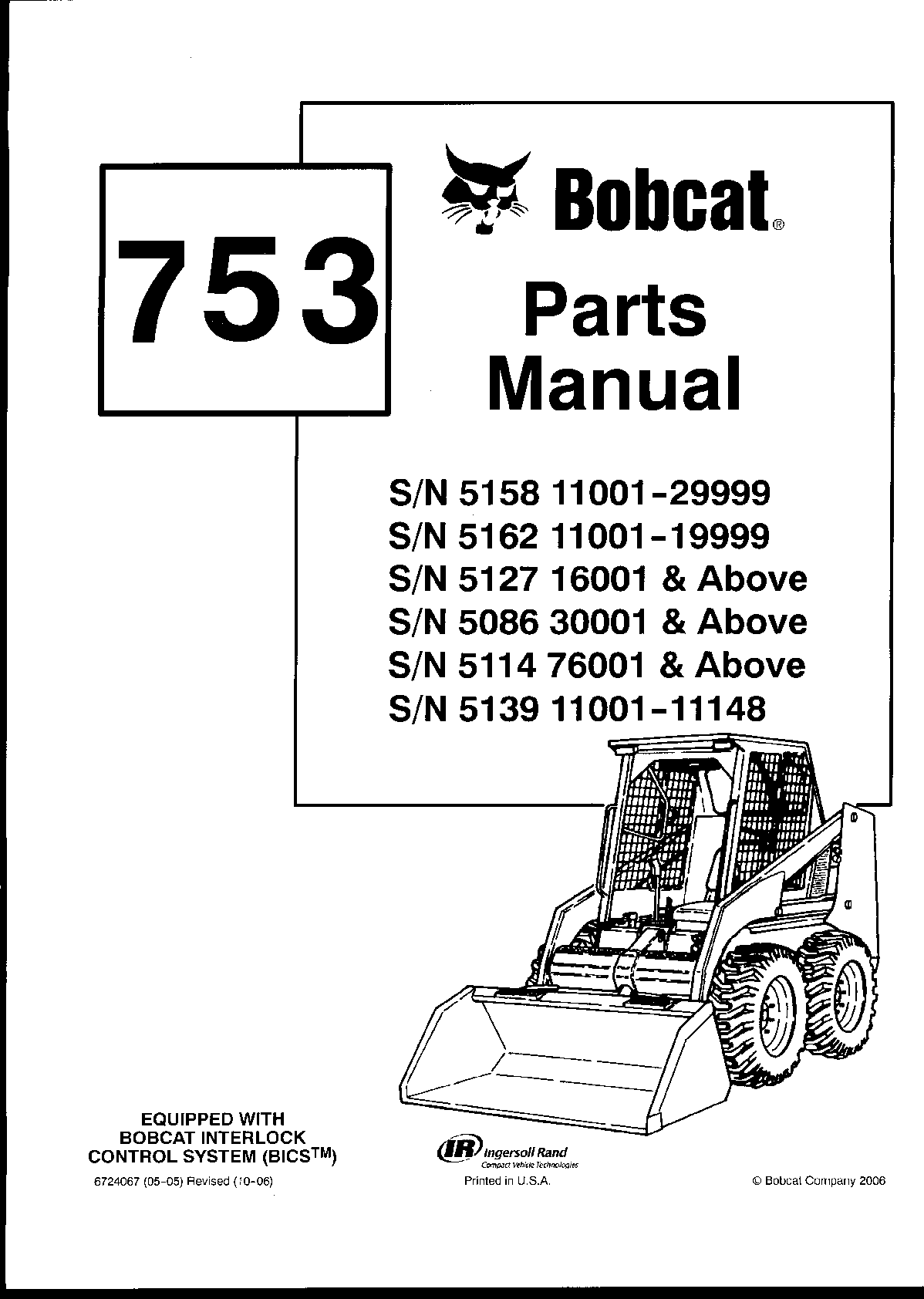 Unlock a complete breakdown of your Bobcat 753 Skid-Steer Loader with this comprehensive Parts Manual from Bobcat Company. This indispensable resource (Part No. 6724067, Revised 10-06) offers detailed exploded-view diagrams and official part numbers to simplify maintenance, repair, and parts ordering. It covers specific serial number ranges including S/N 5158, 5162, 5127, 5086, 5114, & 5139, ensuring you find the right component for your machine, including models equipped with the BICS™ system.
