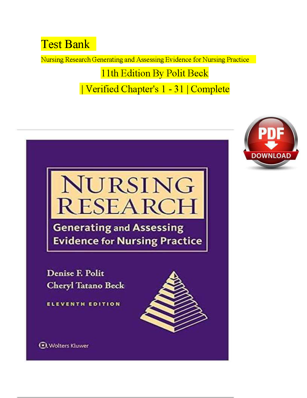 Test Bank for Nursing Research: Generating and Assessing Evidence for Nursing Practice, 11th Edition By Denise F. Polit & Cheryl Tatano Beck (Complete Chapters 1-31)