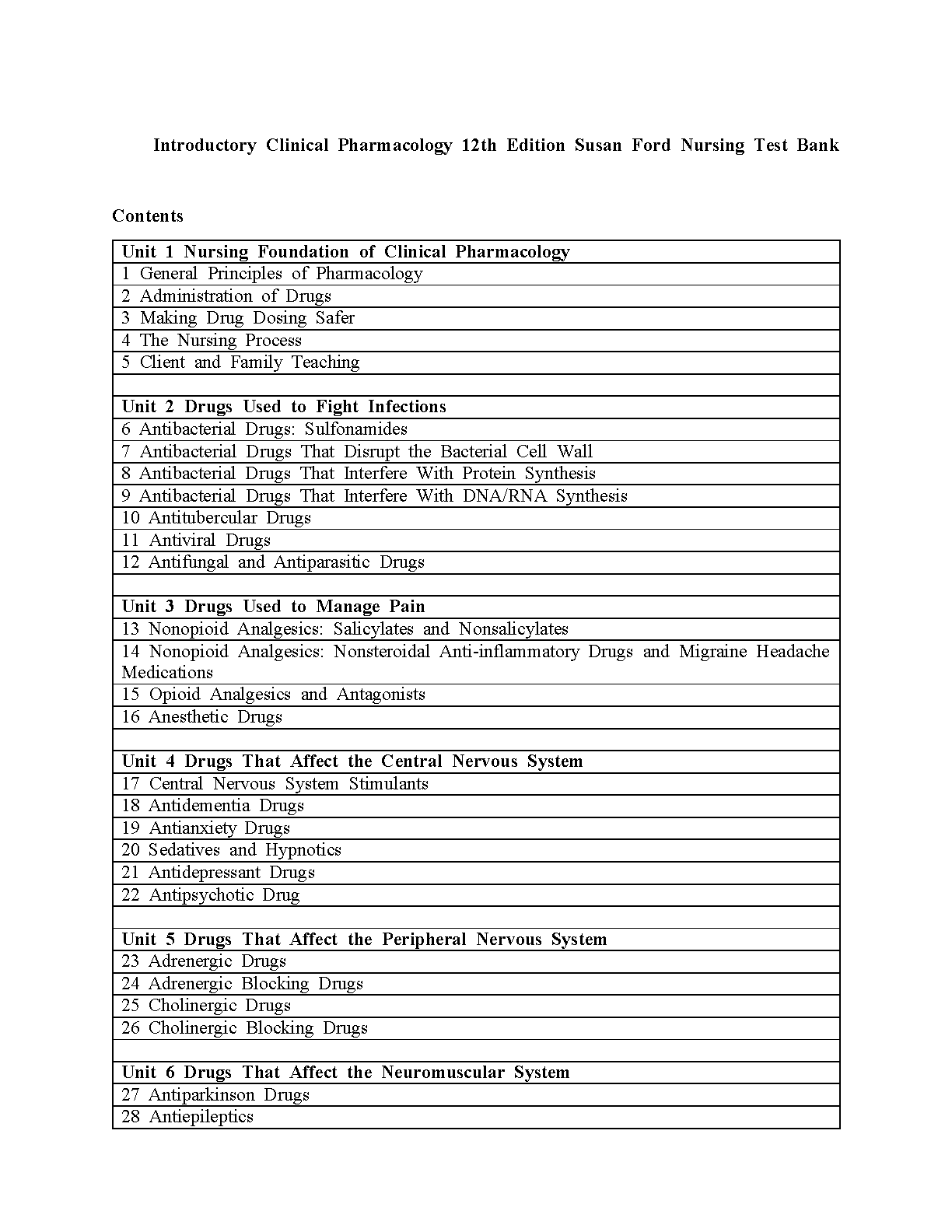 Master your pharmacology course with the complete Test Bank for Introductory Clinical Pharmacology, 12th Edition by Susan M. Ford and Sally S. Roach. This essential study tool provides an extensive collection of practice questions and detailed answers spanning all 54 chapters. Designed to help you thoroughly prepare for exams, reinforce key concepts, and excel in your studies, this test bank is your ultimate guide to success in clinical pharmacology. Gain the confidence to ace your tests with this comprehensive, chapter-by-chapter resource.