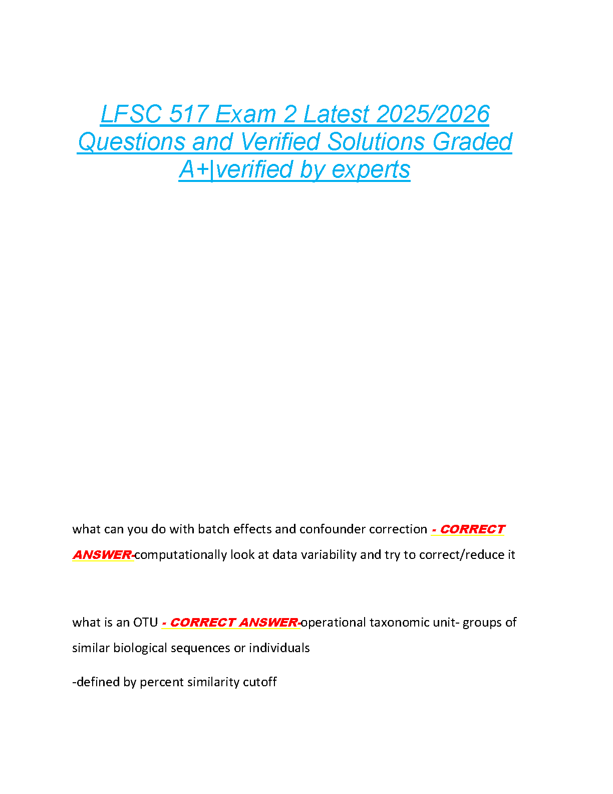 Ace your LFSC 517 Exam 2 with this comprehensive test bank, fully updated for the 2025/2026 academic year. This essential study guide features a complete collection of exam-style questions paired with expertly verified, step-by-step solutions. Master complex topics such as bioinformatics, batch effects, and Operational Taxonomic Units (OTUs) to ensure you are fully prepared. Designed to help you achieve an A+ grade, this resource is your key to passing the exam on your first attempt and avoiding costly resits. Download now for instant access to the materials you need to succeed!
