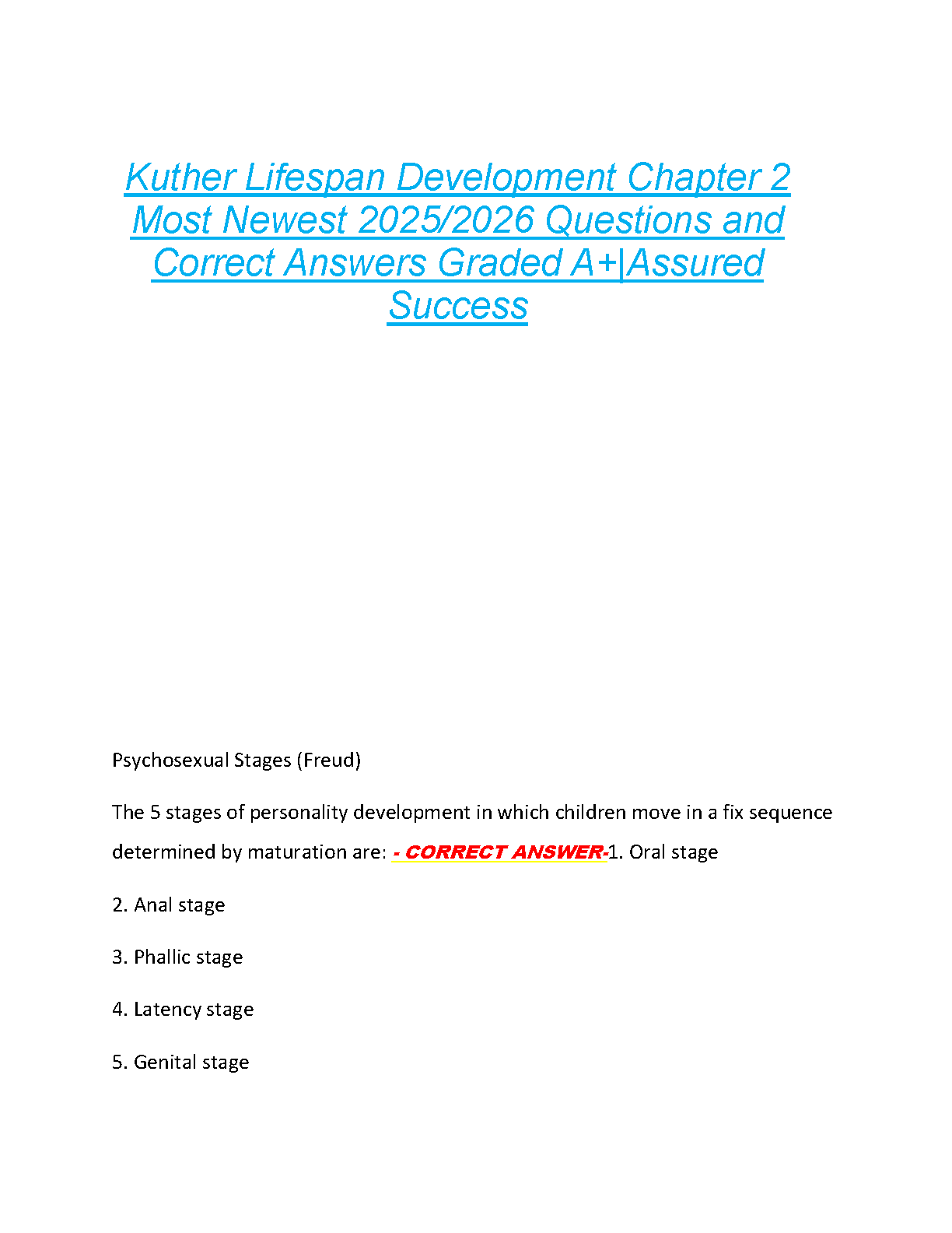 Unlock academic success with our meticulously prepared Test Bank for Chapter 2 of Tara L. Kuther's 'Lifespan Development: Lives in Context,' 6th Edition. This invaluable study guide provides an extensive collection of exam-style questions, each paired with a detailed and accurate answer. Dive deep into the core concepts of Chapter 2, including foundational developmental theories like Freud's psychosexual stages. Designed to help you prepare efficiently, this resource will sharpen your understanding, boost your confidence, and guide you toward achieving top grades on your quizzes and exams.