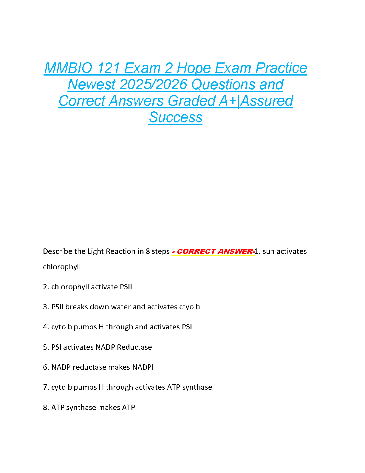 Prepare to ace your MMBIO 121 Exam 2 with this comprehensive and up-to-date test bank for the 2025/2026 academic year. This guide features a collection of practice questions complete with detailed, correct answers, designed to guarantee an A+ grade. Master complex topics, such as the Light Reaction of photosynthesis, and gain the confidence to pass your exam on the first try. This essential study resource is your key to avoiding resits and achieving academic success in MMBIO 121.