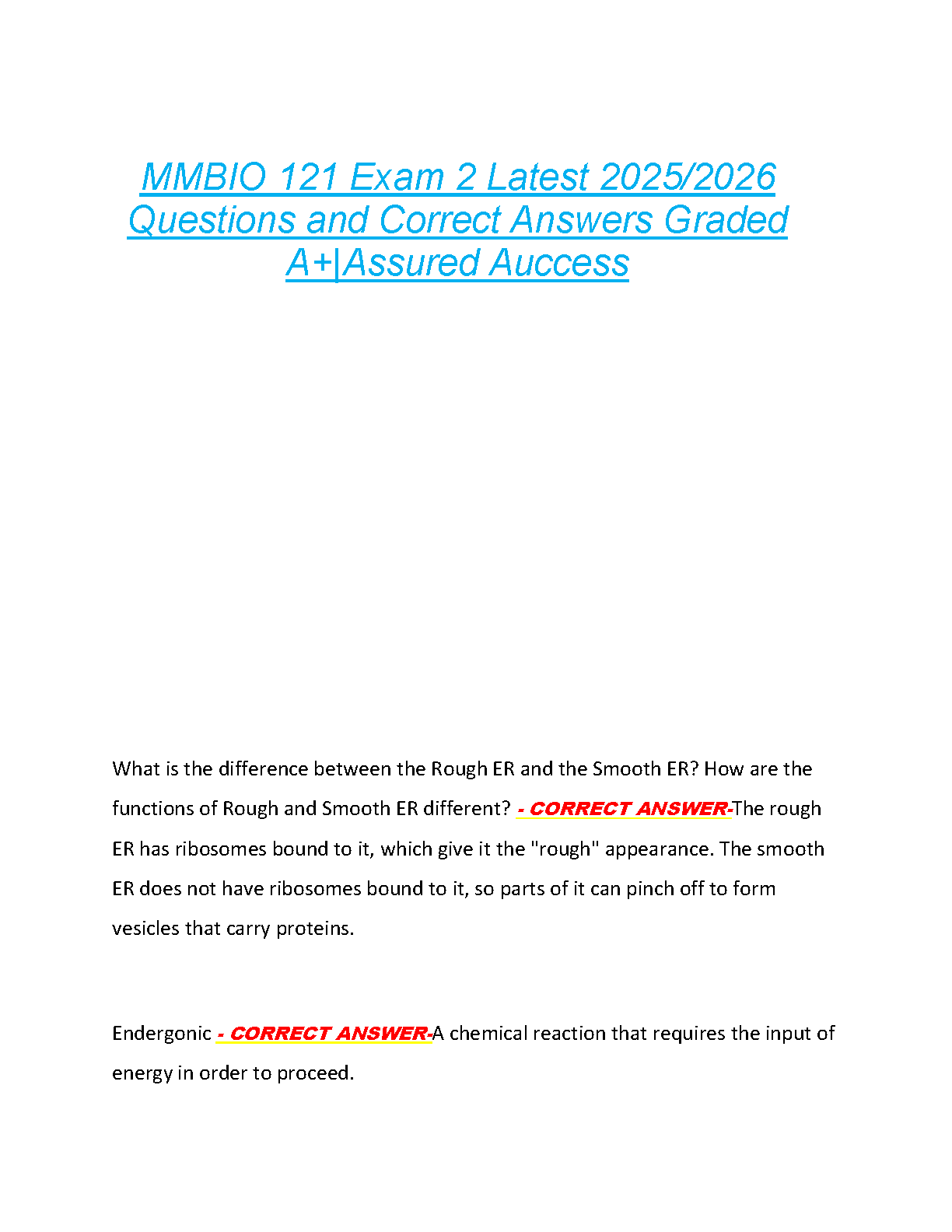 Unlock academic excellence in your MMBIO 121 course with this comprehensive test bank for Exam 2, updated for the 2025/2026 academic year. This resource is meticulously designed to align with 'Brock Biology of Microorganisms, 16th Edition' by Madigan et al., covering all essential topics you'll face. Inside, you'll find an extensive collection of exam questions, each paired with a verified, correct answer. Master key concepts such as the differences between Rough and Smooth ER, endergonic reactions, and other critical microbiology principles. This study guide is your ultimate tool to prepare effectively, deepen your understanding, and pass your exam on the first attempt with an A+ grade.