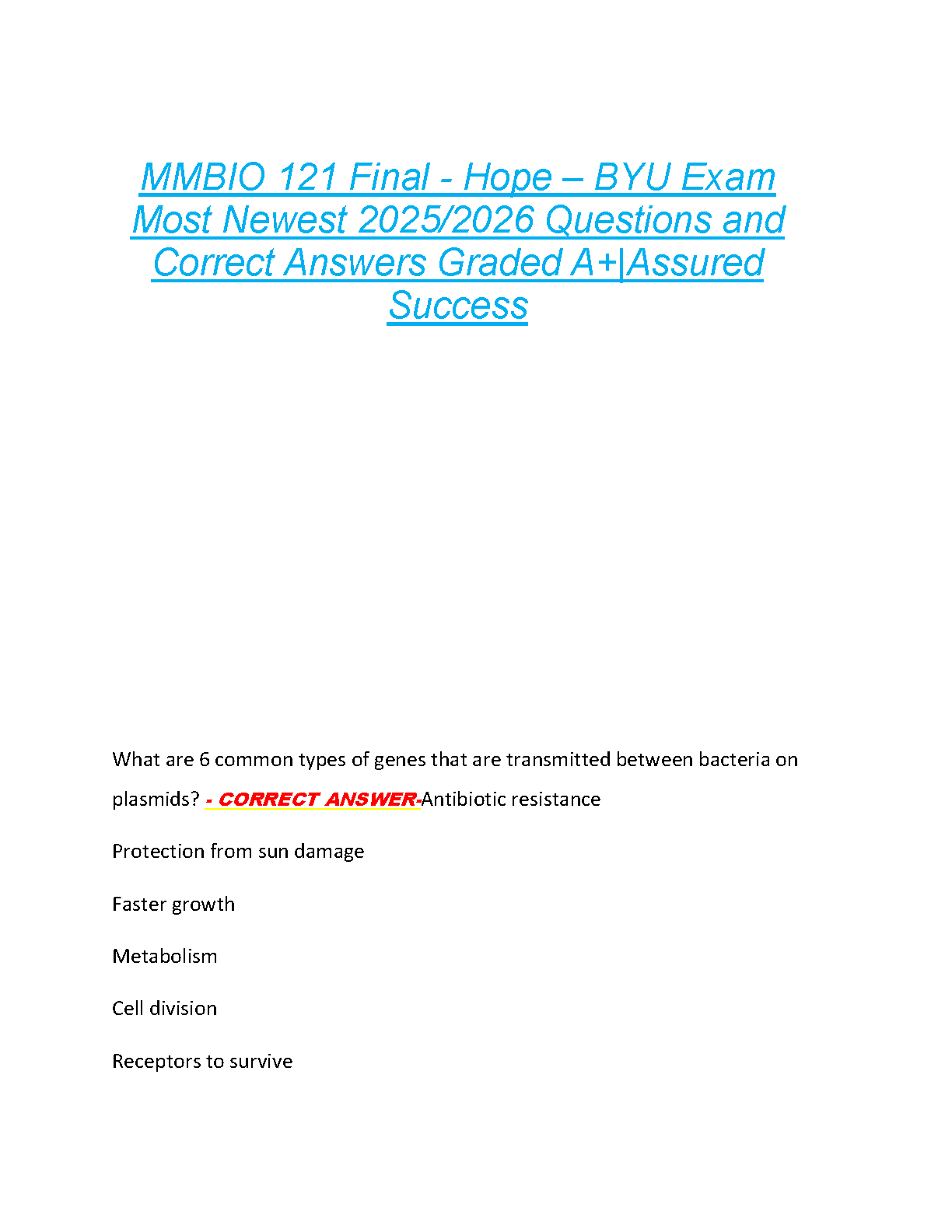 Ace your MMBIO 121 final exam at BYU with this comprehensive and up-to-date test bank for the 2025/2026 academic year. This resource, tailored to 'Brock Biology of Microorganisms, 16th Edition' by Madigan et al., provides a complete set of questions with verified, correct answers. Master complex topics in General Biology: Micro, including bacterial gene transmission via plasmids and antibiotic resistance. This study guide is expertly crafted to help you understand the material deeply, ensuring you can pass your final on the first attempt with an A+ grade. Avoid resits and study smarter with this essential exam preparation tool.