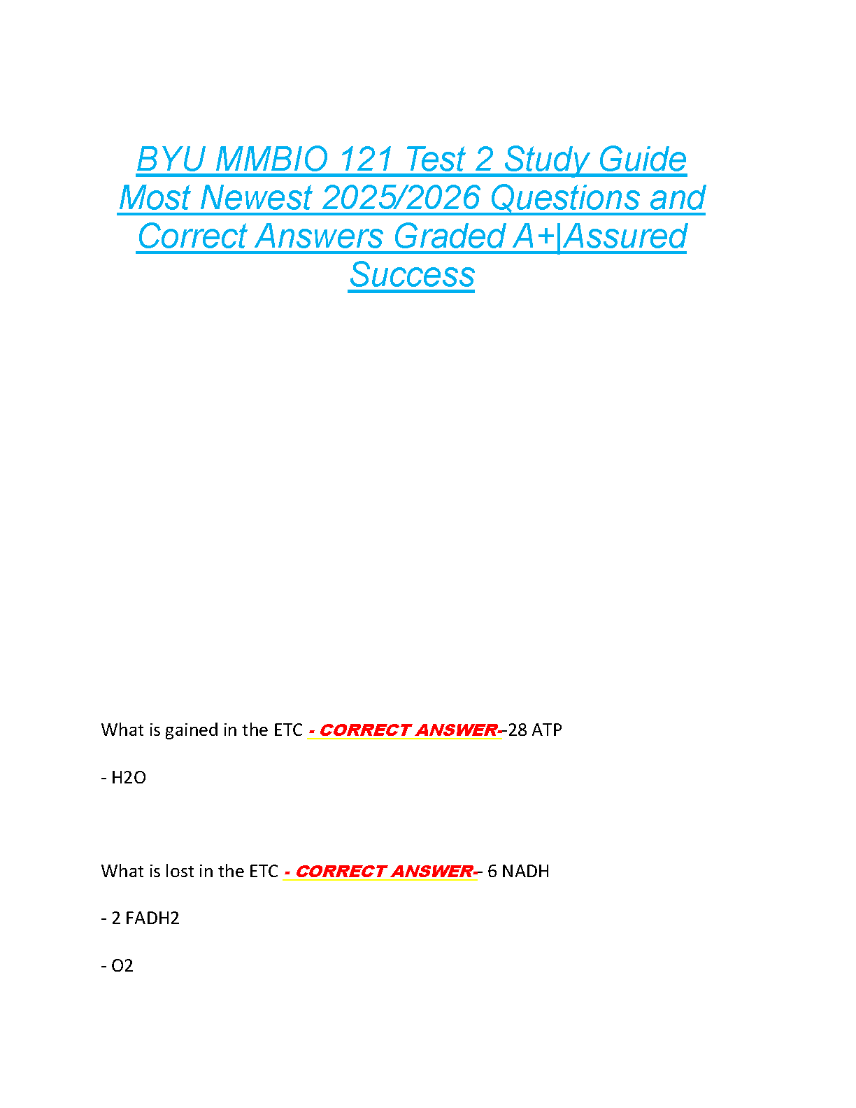 Excel in your General Microbiology course with the ultimate study resource for BYU MMBIO 121 Test 2. This comprehensive test bank, fully updated for the 2025/2026 academic year, is meticulously crafted to align with 'Brock Biology of Microorganisms, 16th Edition'. It features a vast collection of exam-style questions with verified, A+ graded answers, covering critical topics like the Electron Transport Chain (ETC) and more. Stop worrying about resits and secure your success on the first try. Download now to gain the confidence and knowledge needed to ace your exam!