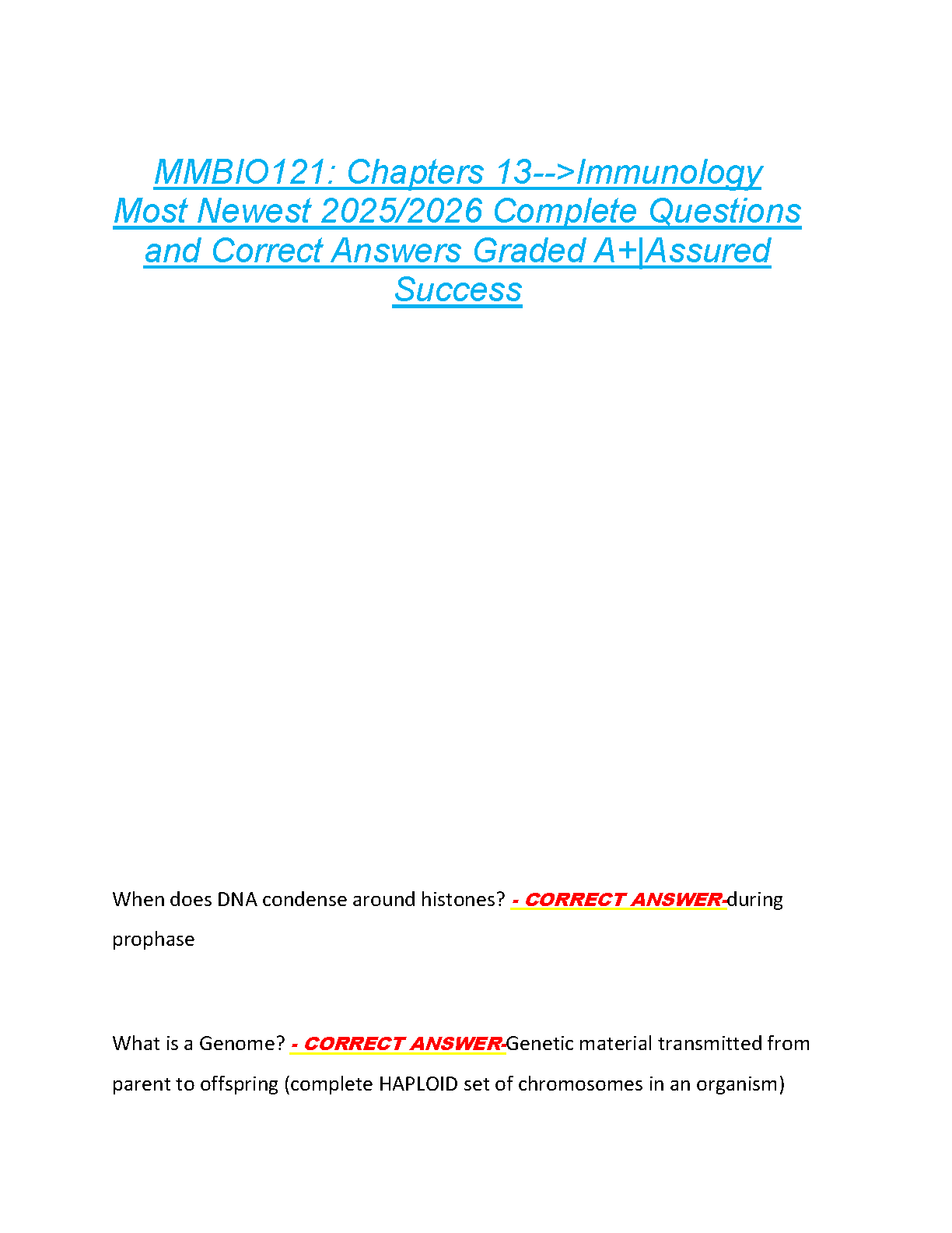 Unlock academic success in your MMBIO 121 course with our ultimate test bank for Immunology, focusing on Chapter 13 onwards. This expertly compiled resource for the 2025/2026 academic year provides a comprehensive collection of exam-style questions paired with 100% accurate, verified answers. Master key concepts, prepare effectively for your exams, and achieve that A+ grade you're aiming for. Stop worrying about resits and start studying smarter with this essential guide to passing on your first attempt.