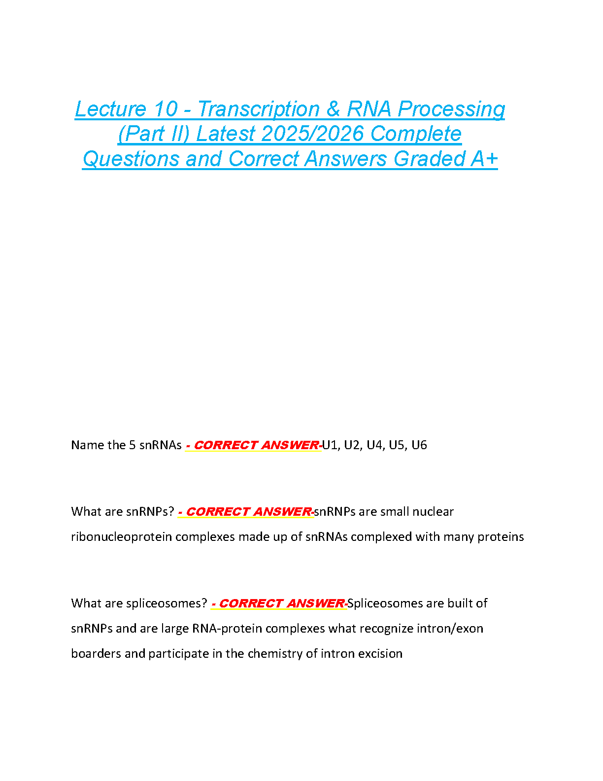 Struggling with the complexities of gene expression? This essential study resource for the 2025/2026 academic year delves deep into Lecture 10, Part II: Transcription and RNA Processing. It features a complete set of meticulously compiled questions and verified correct answers, covering critical topics like snRNAs, snRNPs, and spliceosomes. Designed to help you achieve an A+ grade, this guide is your key to mastering the material and passing your exams confidently on the first try. Say goodbye to exam stress and resits with this comprehensive and up-to-date exam elaboration.