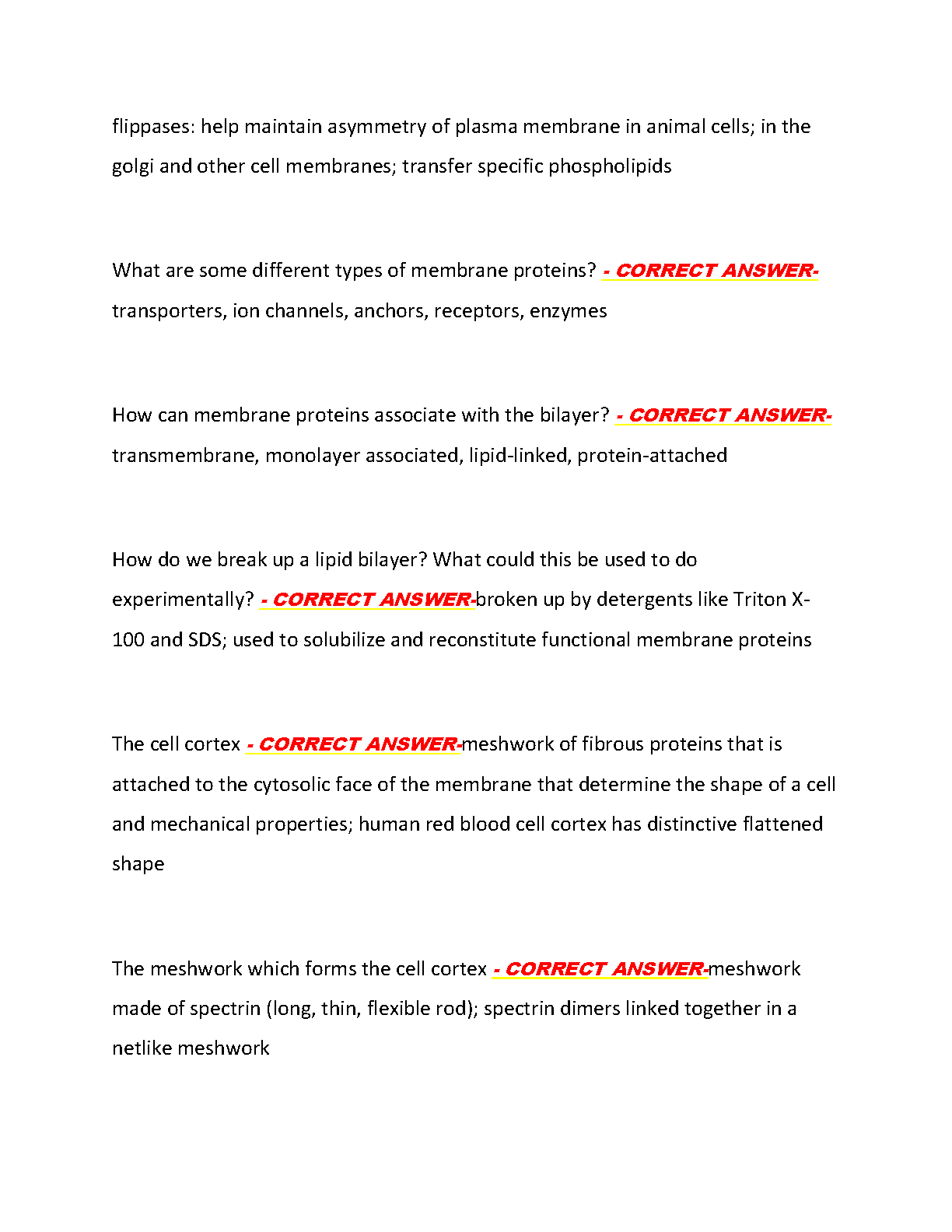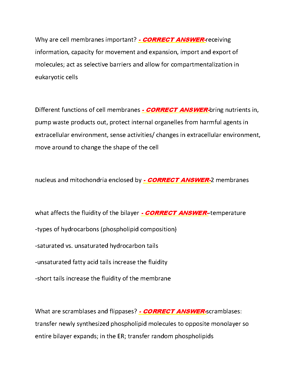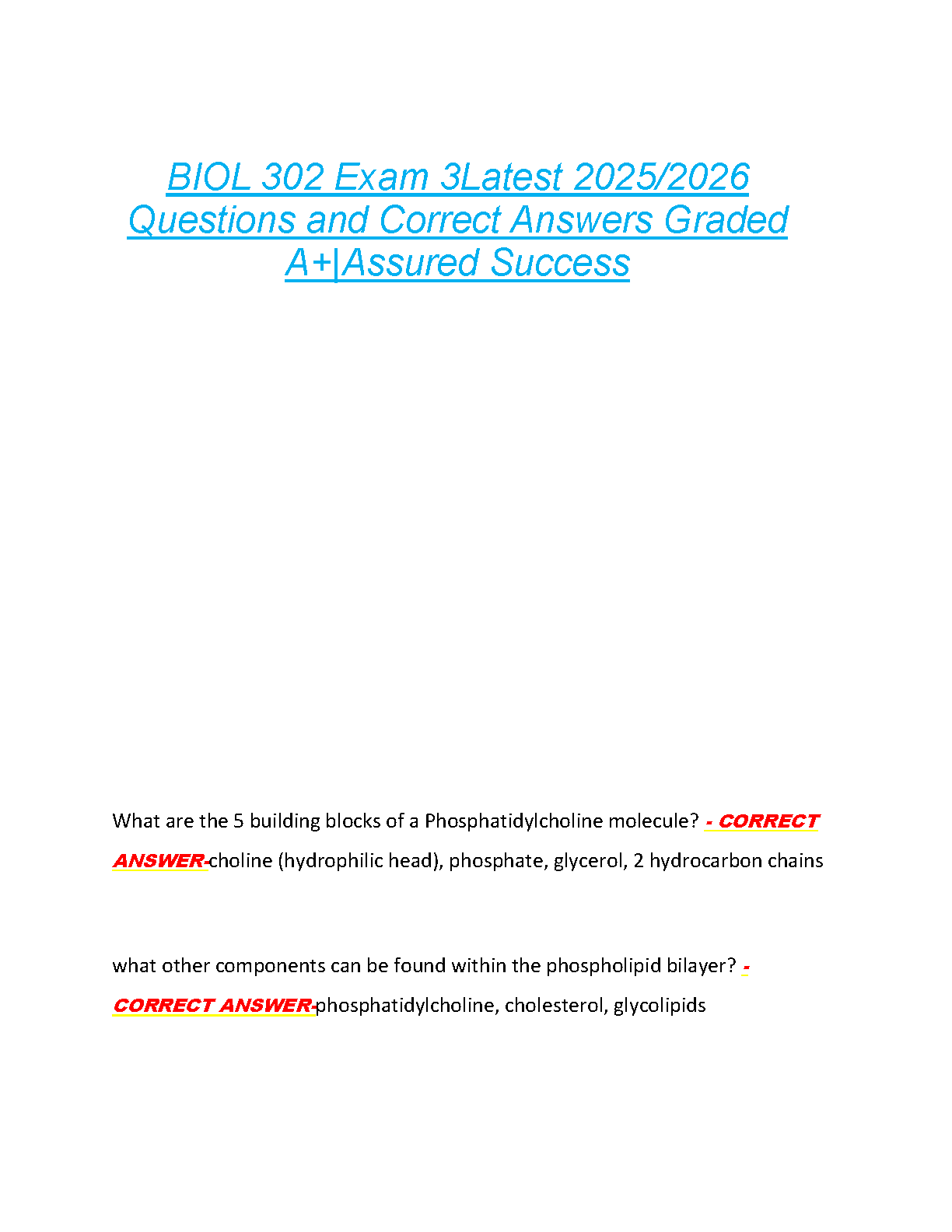 Prepare to excel in your BIOL 302 Exam 3 with our comprehensive test bank for the 2025/2026 academic year. This meticulously compiled resource features a wide range of potential exam questions, each paired with detailed, correct answers that have been verified for accuracy. Covering key topics in cell and molecular biology, such as the structure of the phospholipid bilayer, this study guide is your ultimate tool for success. Stop stressing and start studying smart. Download now to master the material, boost your confidence, and secure the A+ grade you deserve on your first try!