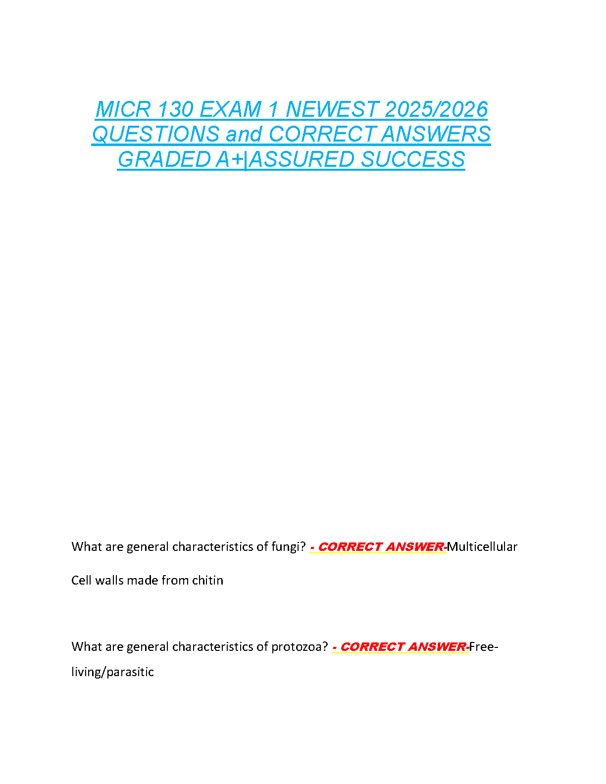 Unlock academic success in your microbiology course with our premier MICR 130 Exam 1 Test Bank. This comprehensive study resource is fully updated for the 2025/2026 academic year, featuring a complete set of exam-style questions and expertly verified correct answers. Designed to help you master key topics and concepts, this guide is your key to achieving an A+ grade. Prepare effectively, build confidence, and pass your first exam with flying colors, avoiding the stress of resits.