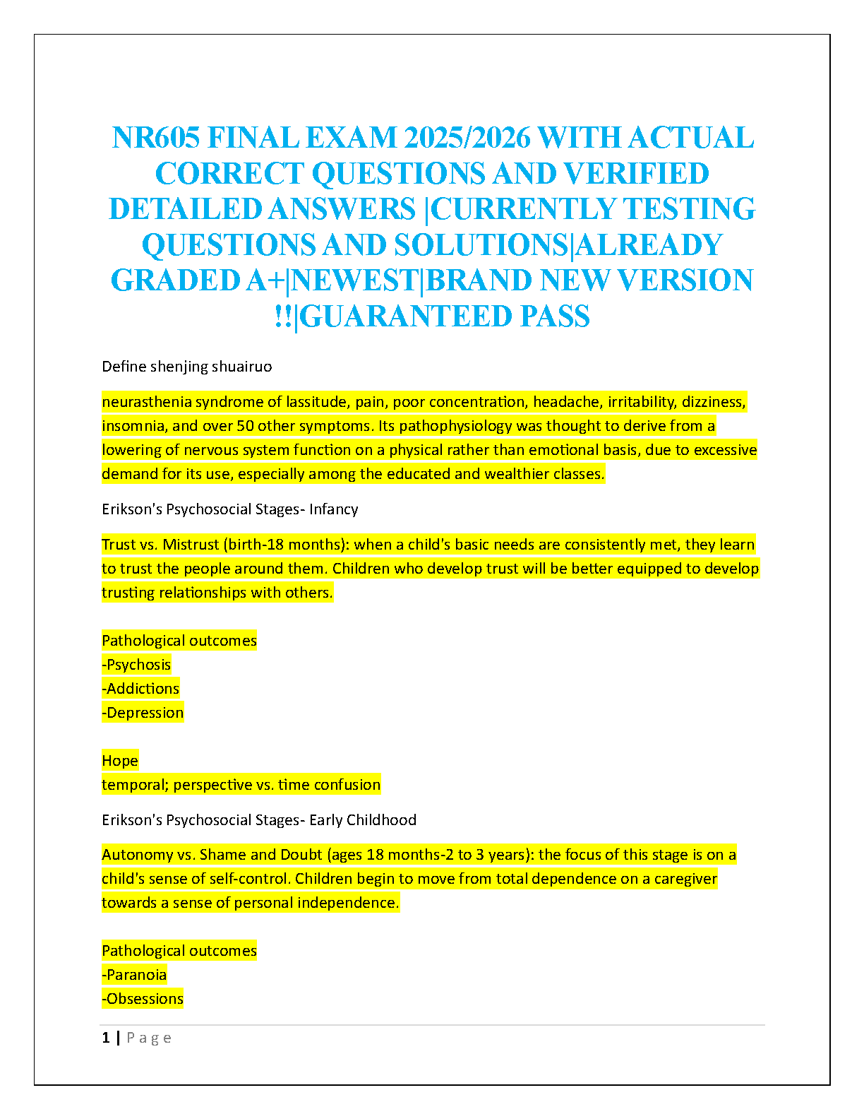 Ace your NR605 Final Exam with our latest 2025/2026 Test Bank. This comprehensive study guide features a complete collection of actual exam questions paired with expertly verified, detailed answers and solutions. Already proven to achieve A+ grades, this resource is designed to help you master key concepts, including Erikson's Psychosocial Stages, and pass on your first attempt. Stop stressing and start studying smarter with this guaranteed-pass study solution.