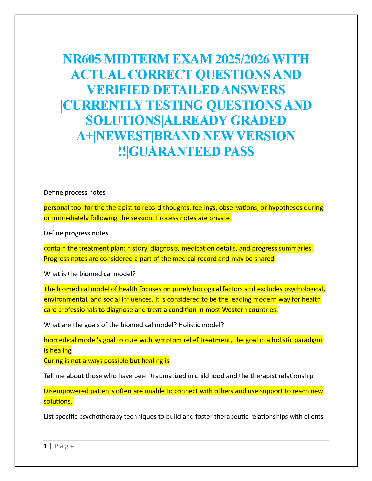 Ace your NR605 Midterm Exam with our comprehensive Test Bank, fully updated for the 2025/2026 academic year. This A+ graded resource contains a complete set of currently tested questions paired with expertly verified, detailed answers and rationales. Master key concepts such as the distinction between process and progress notes, the biomedical vs. holistic models of care, and essential psychotherapy techniques. This study guide is your ultimate tool for success, designed to help you pass on your first attempt and achieve the highest grade.