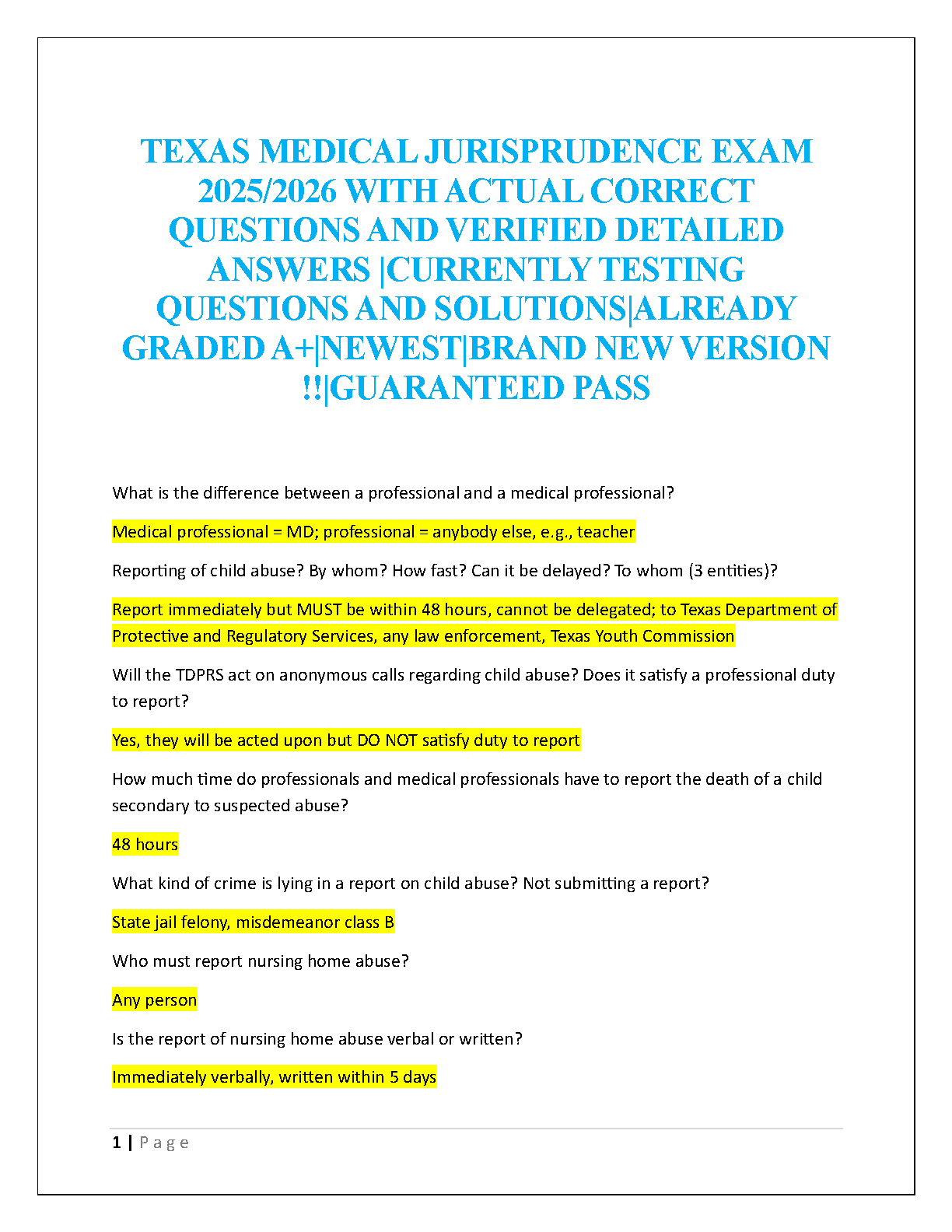Ace your Texas Medical Jurisprudence Exam on the first try with our comprehensive 2025/2026 test bank. This top-rated study guide features a complete collection of the latest, actual exam questions meticulously paired with verified, detailed answers and solutions. Designed for success, this resource is already graded A+ and is your key to mastering the legal and ethical responsibilities of practicing medicine in Texas. Stop worrying about the exam and secure your guaranteed pass with our brand new, updated study material.