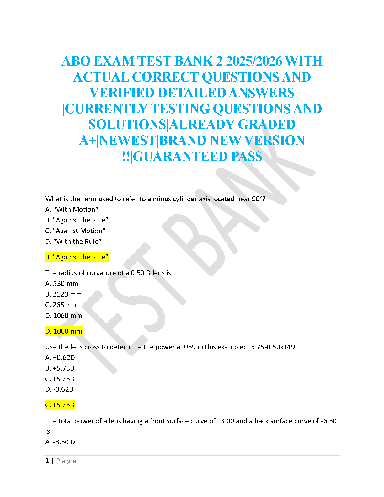Master the American Board of Opticianry (ABO) exam with our comprehensive test bank, fully updated for the 2025/2026 certification cycle. This A+ graded resource is meticulously compiled with the latest, verified questions and in-depth, detailed answers and solutions. Each question reflects current testing materials, ensuring you study the most relevant content to pass on your first try. Eliminate exam stress and avoid costly resits with this ultimate study guide, designed to guarantee your success and help you ace the ABO certification exam.
