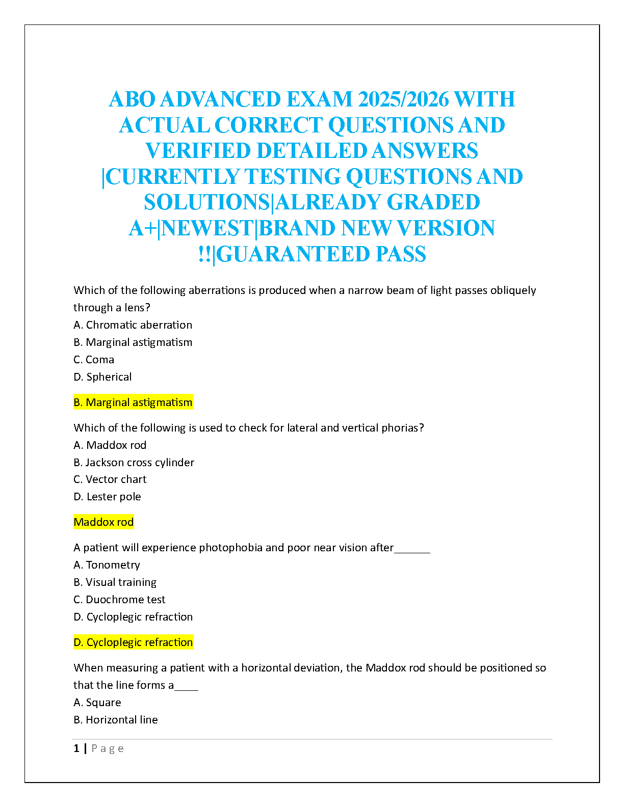 Unlock a guaranteed pass on your ABO Advanced Certification Exam with our premier 2025/2026 test bank. This digital resource is packed with the latest, A+ graded questions and expertly verified answers, reflecting the most current exam format. Dive deep into essential opticianry topics, from lens aberrations to clinical procedures, with detailed solutions that clarify complex concepts. Stop worrying about resits and start studying with confidence. This is the ultimate study tool designed to help you master the material and pass on your first attempt. Download now and take the first step towards your advanced certification!
