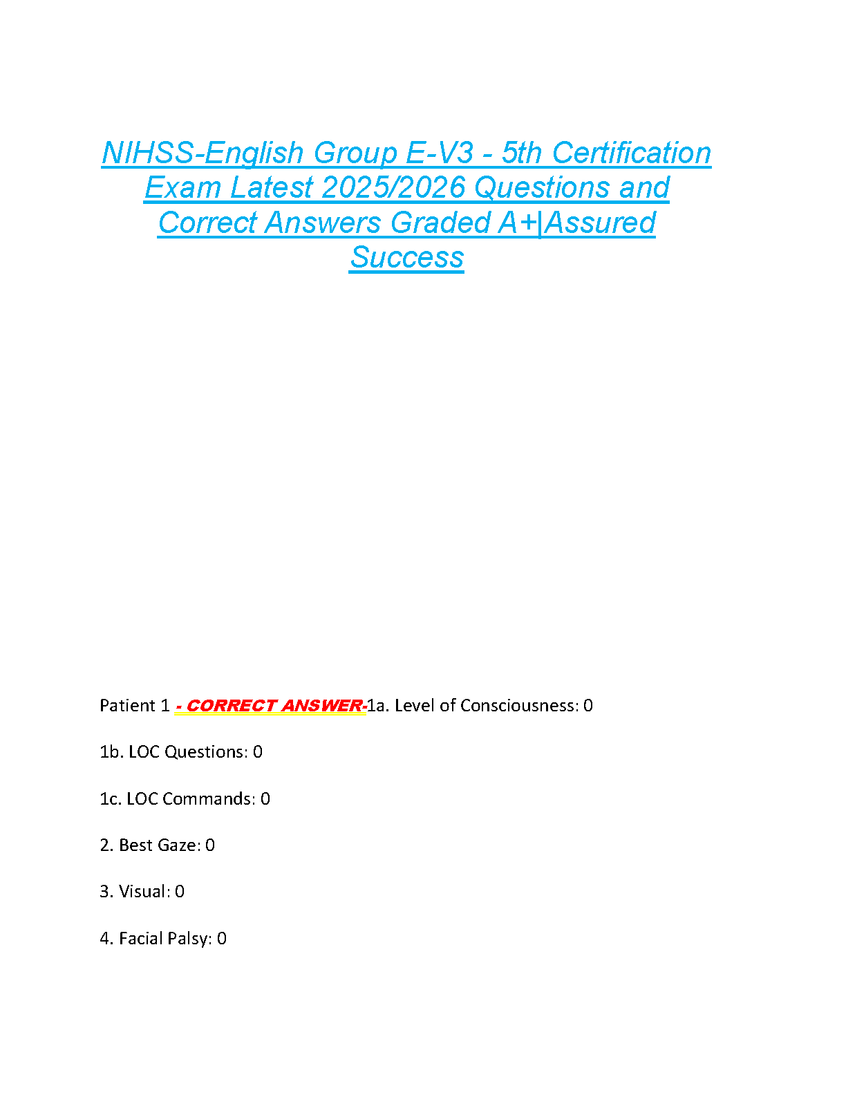 Prepare to ace your National Institutes of Health Stroke Scale (NIHSS) certification with our premier test bank for the English Group E-V3, 5th Certification exam. This newly updated 2025/2026 edition features a comprehensive collection of exam questions paired with 100% correct, verified answers. Designed for healthcare professionals seeking guaranteed success, this resource covers all critical assessment areas to ensure you pass on your first attempt. Boost your confidence and master the NIHSS scoring system with these A+ graded materials.