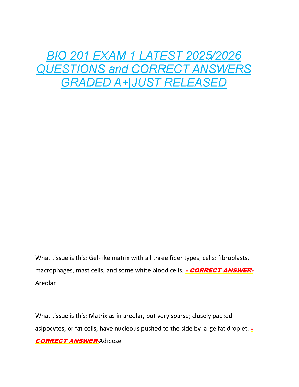 Get ready to ace your BIO 201 Exam 1 with our latest test bank for the 2025/2026 academic year. This comprehensive resource is packed with a wide range of questions and meticulously verified answers, covering key topics from the start of your course, such as tissue identification and basic biology concepts. Designed to help you study effectively and understand the material deeply, this guide is your key to achieving an A+ grade. Don't leave your success to chance—download this just-released study aid and pass your exam with confidence on the first attempt!