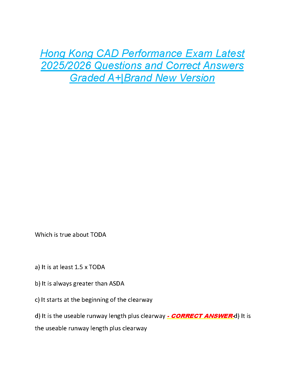 Master the Hong Kong Civil Aviation Department (CAD) Performance Exam with our ultimate 2025/2026 Test Bank. This brand-new, A+ graded resource provides a complete set of the latest exam questions paired with verified, correct answers. Expertly designed to streamline your studies, this guide ensures you understand all critical topics, enabling you to pass confidently on your first attempt and avoid costly resits. Secure your certification and advance your aviation career with this essential study tool.
