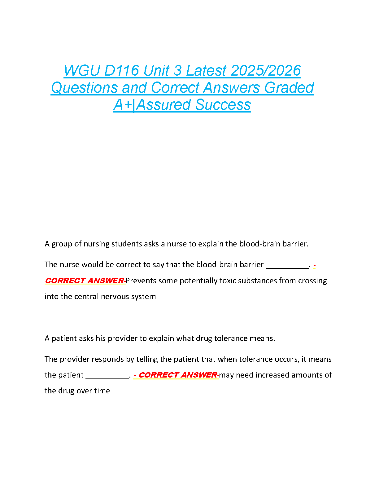 Unlock top grades in your WGU D116 Pharmacological Principles course with our meticulously prepared Unit 3 Exam Elaboration. This up-to-date 2025/2026 resource features a complete set of exam-style questions paired with verified, A+ graded answers. Master complex topics and build confidence for your upcoming test. Designed specifically to help students pass on their first try, this study guide is your key to avoiding resits and achieving academic excellence. Get the edge you need for guaranteed success!